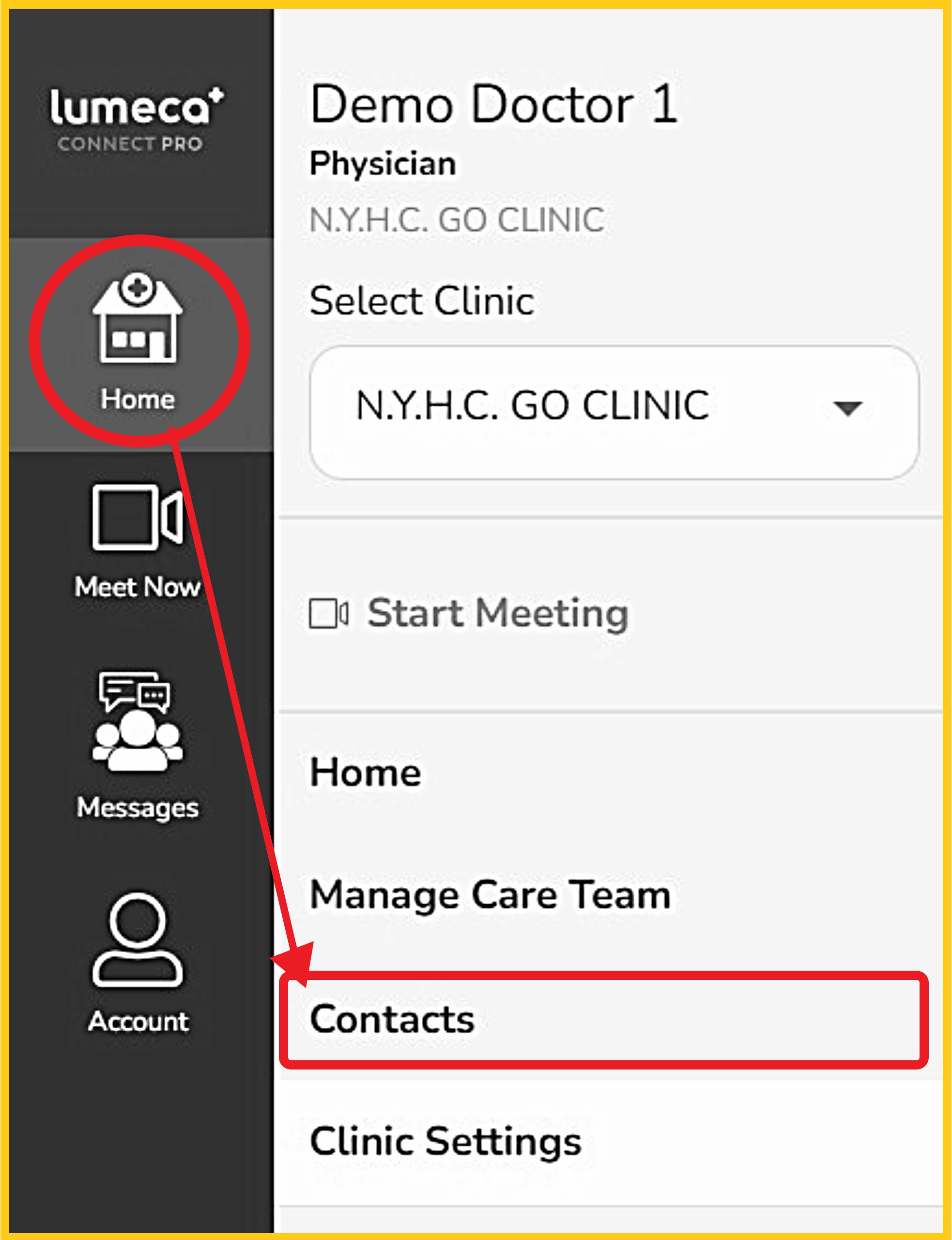 Step 1 - From the left navigation bar, select 'Home', then choose 'Contacts'.
