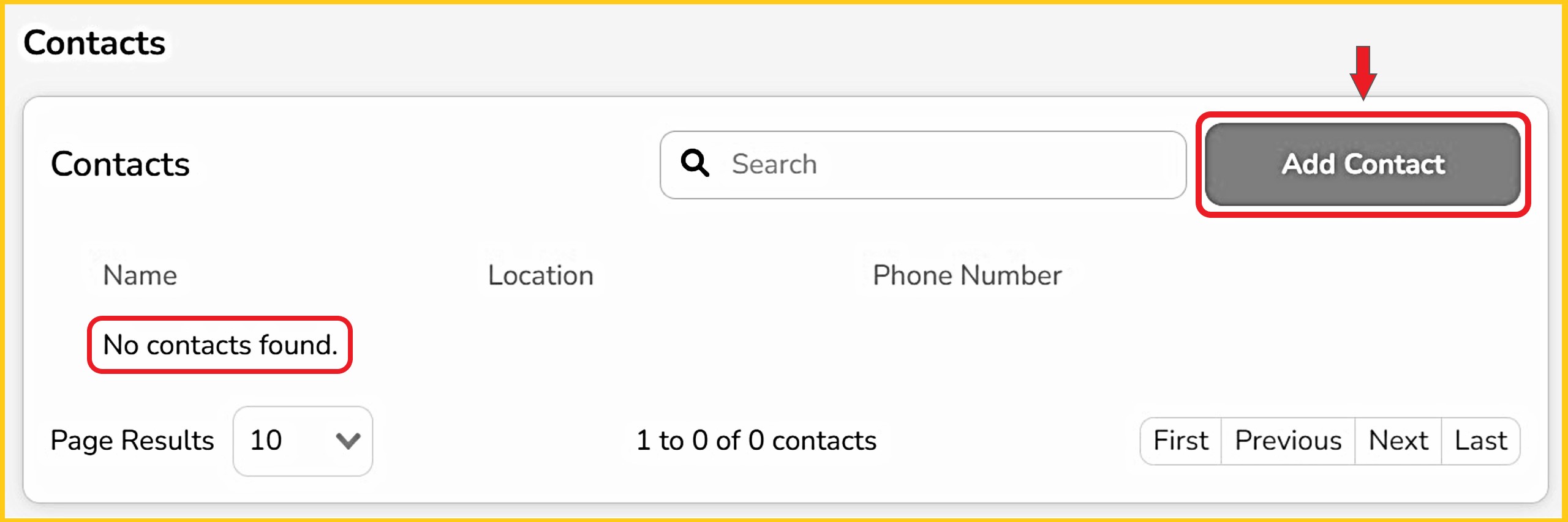Step 2 - Until contacts are added, there will be no one listed. Click 'Add Contact'.