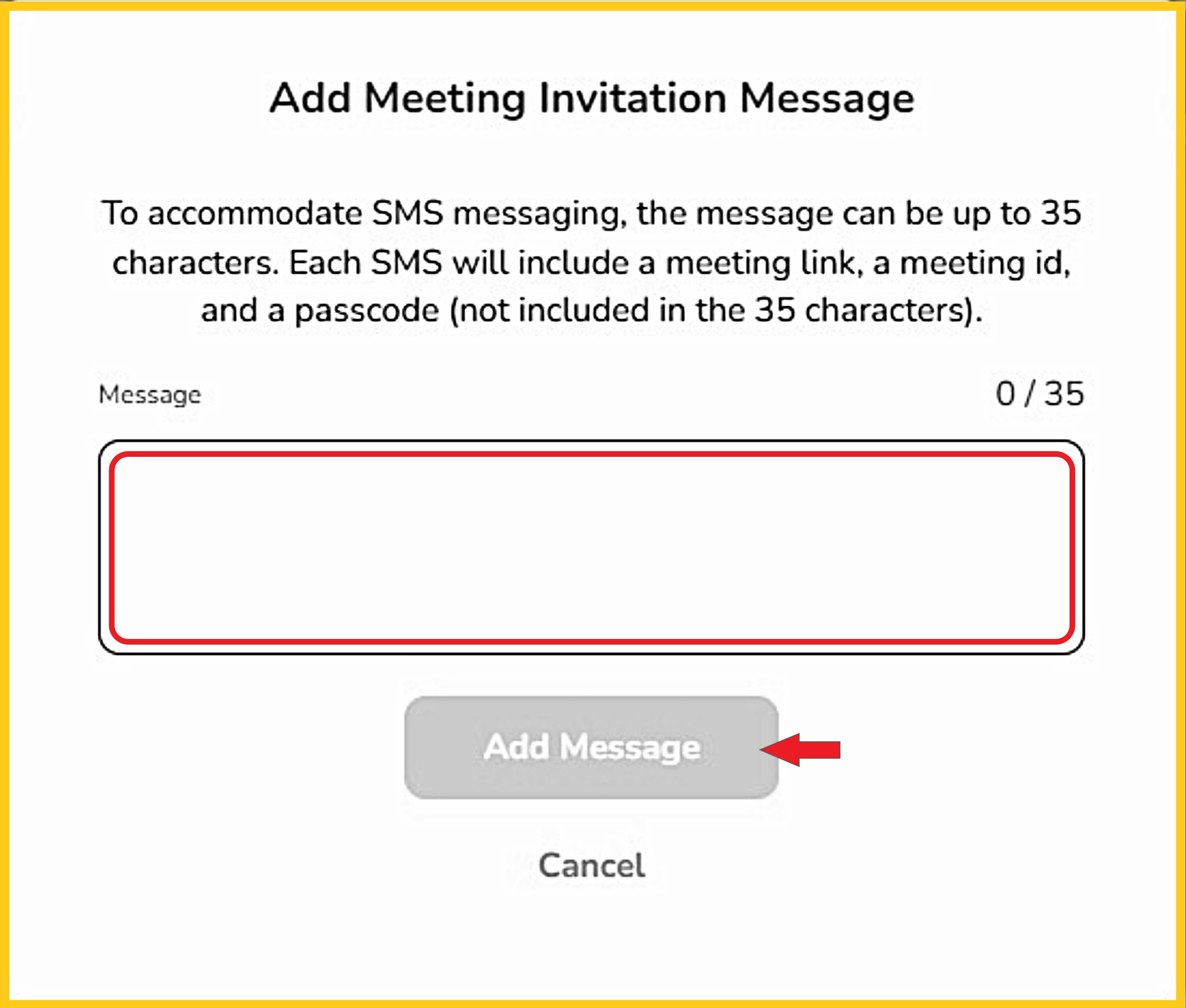 When inviting other participants to meetings, you may customize the message you send via SMS text or email. Every message will also contain the meeting 'https://...' quick link, ID and Passcode.
