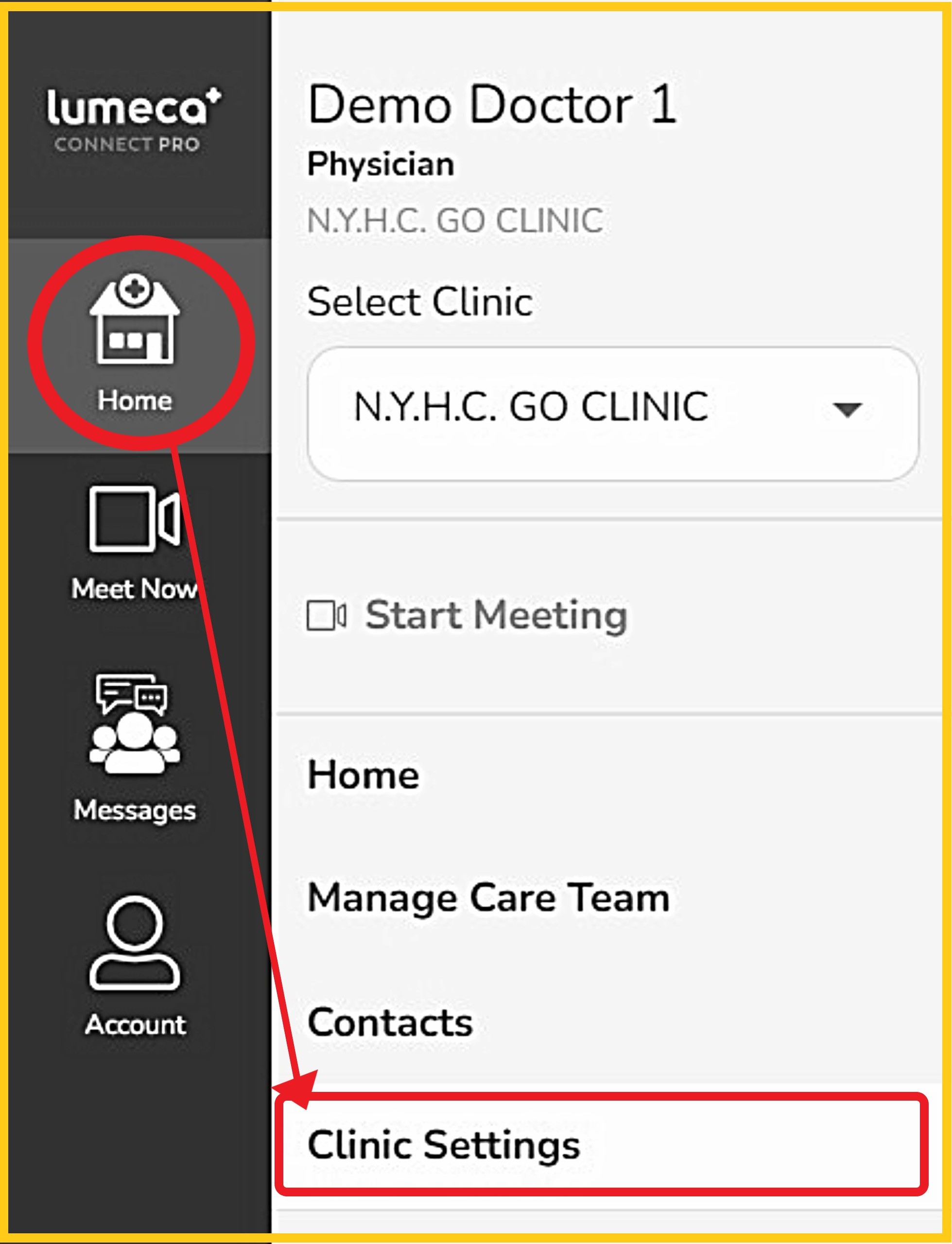 Step 1 - From the left navigation bar, click 'Home', then choose 'Clinic Settings'.