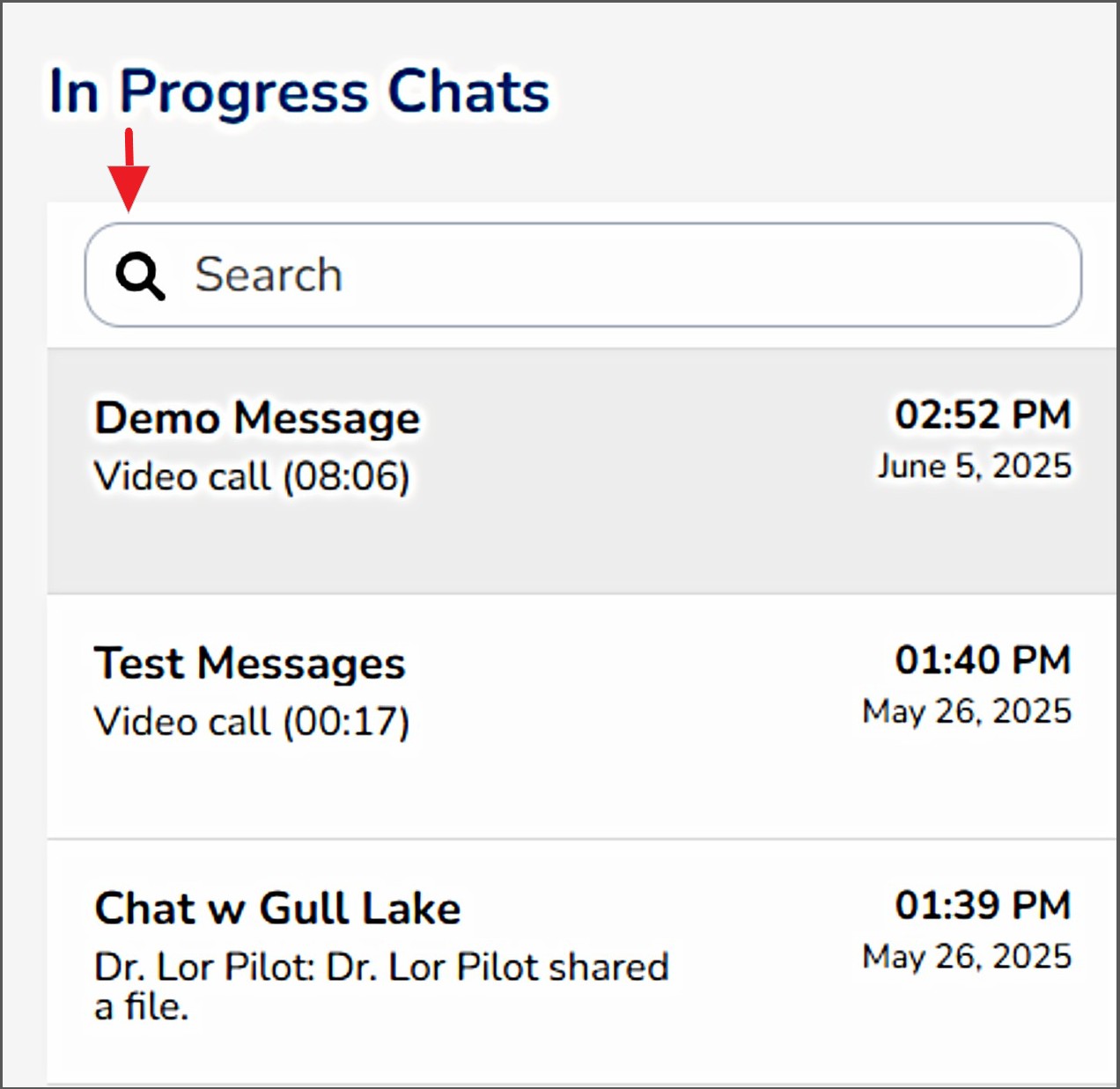 Step 3 - Your active messages will be listed, with the most current message at the top OR you may 'Search' for a specific message by title, Chat ID # or participant name.