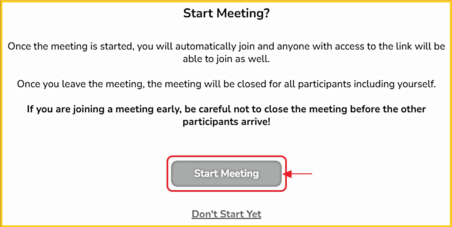 Step 4 - Review the messages on the 'Start Meeting?' screen. Click 'Start Meeting' when ready to begin.