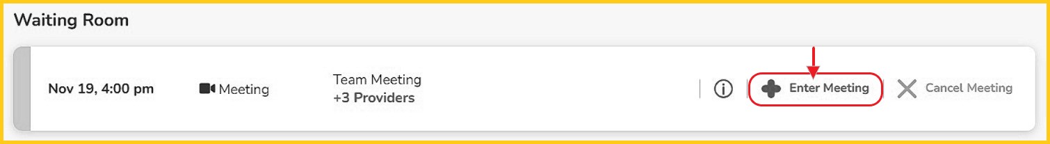 Step 3 - Find and click on the scheduled meeting that you would like to enter. From here choose the 'Enter Meeting' icon. This will take you into the meeting.
