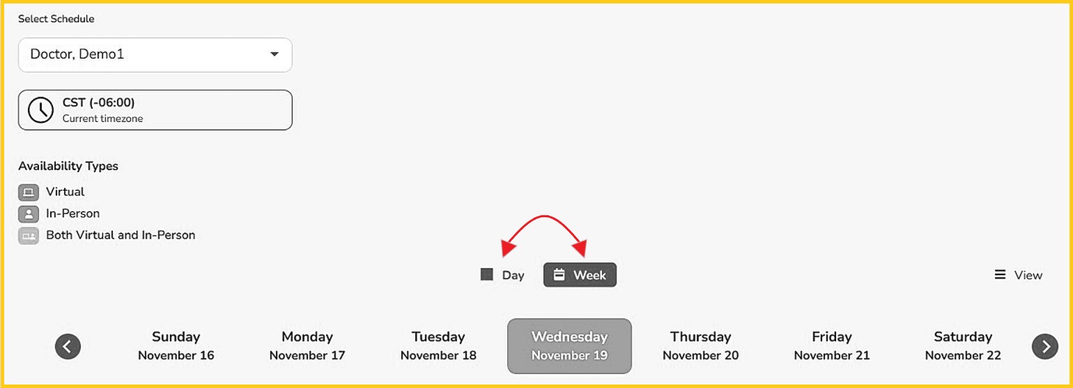 Step 2 - Choose the View where you would like to find your appointment. (The screen defaults to 'Weekly' view).