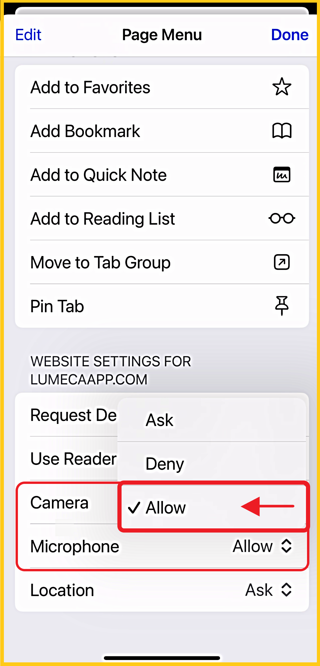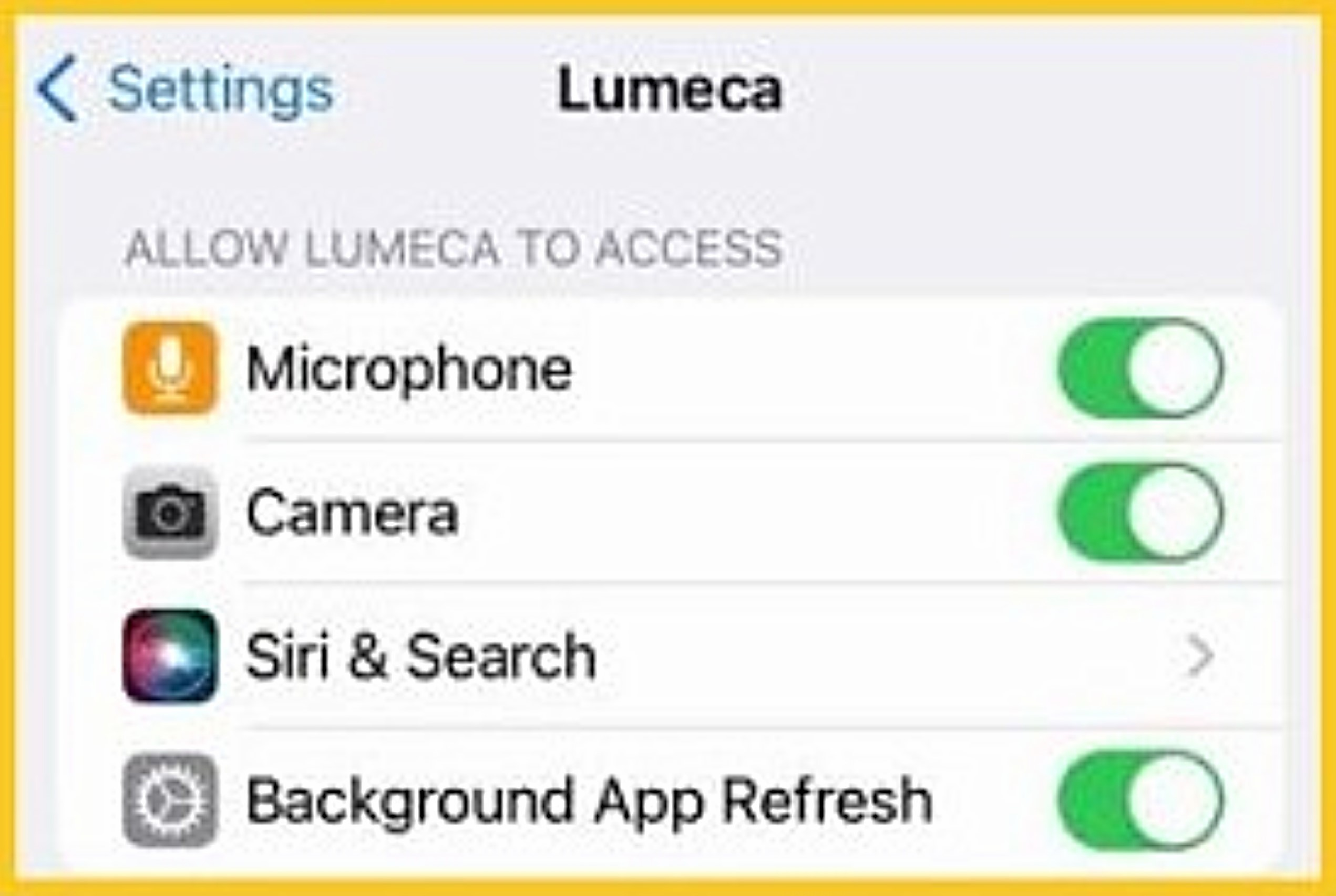 - Under 'Allow Lumeca to Access', click on each toggle to enable camera and microphone permissions, if not already done.