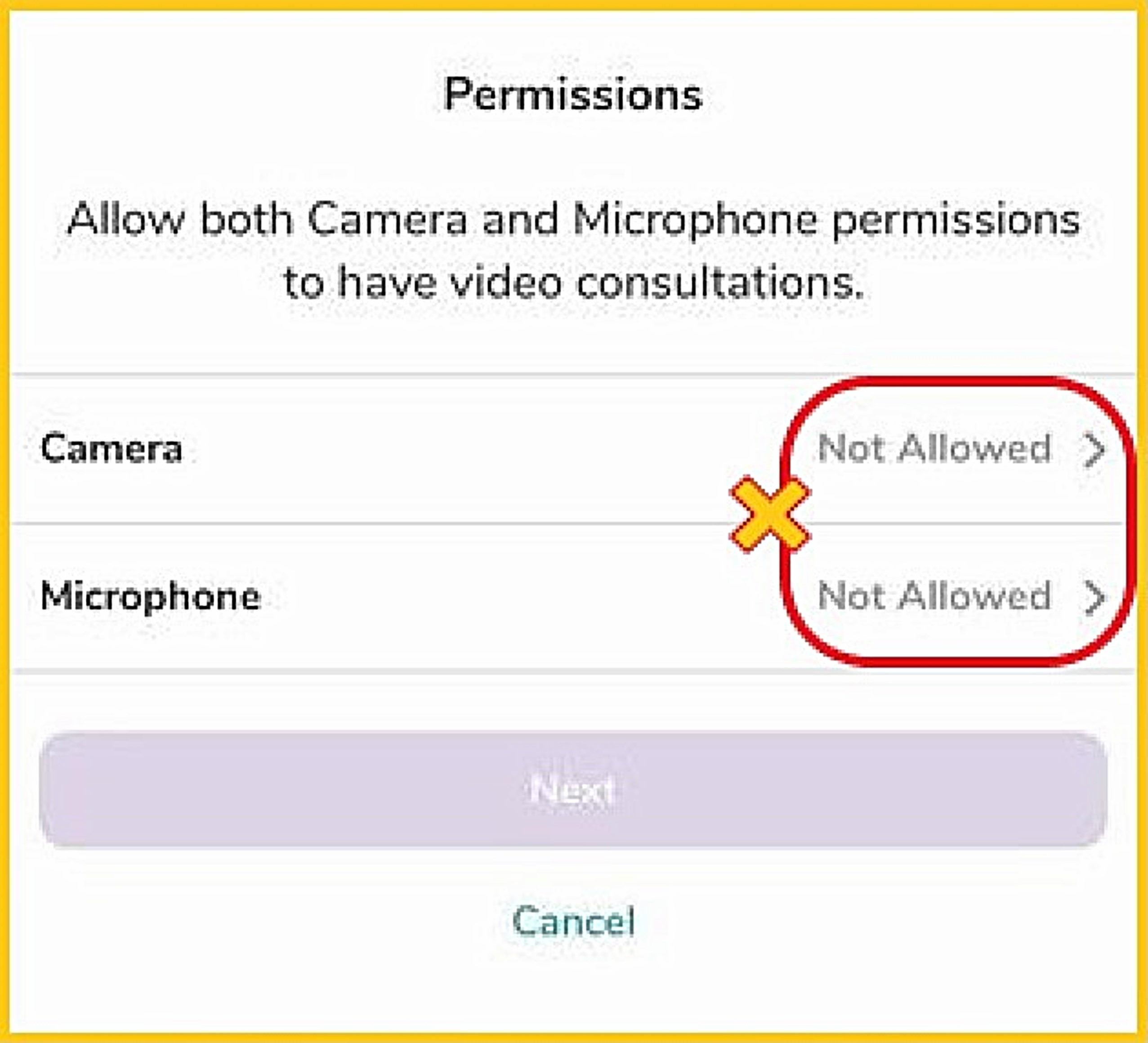 - Tap 'Not Allowed' and choose 'Allow' to use your Camera and Microphone for SK Virtual Visit.
