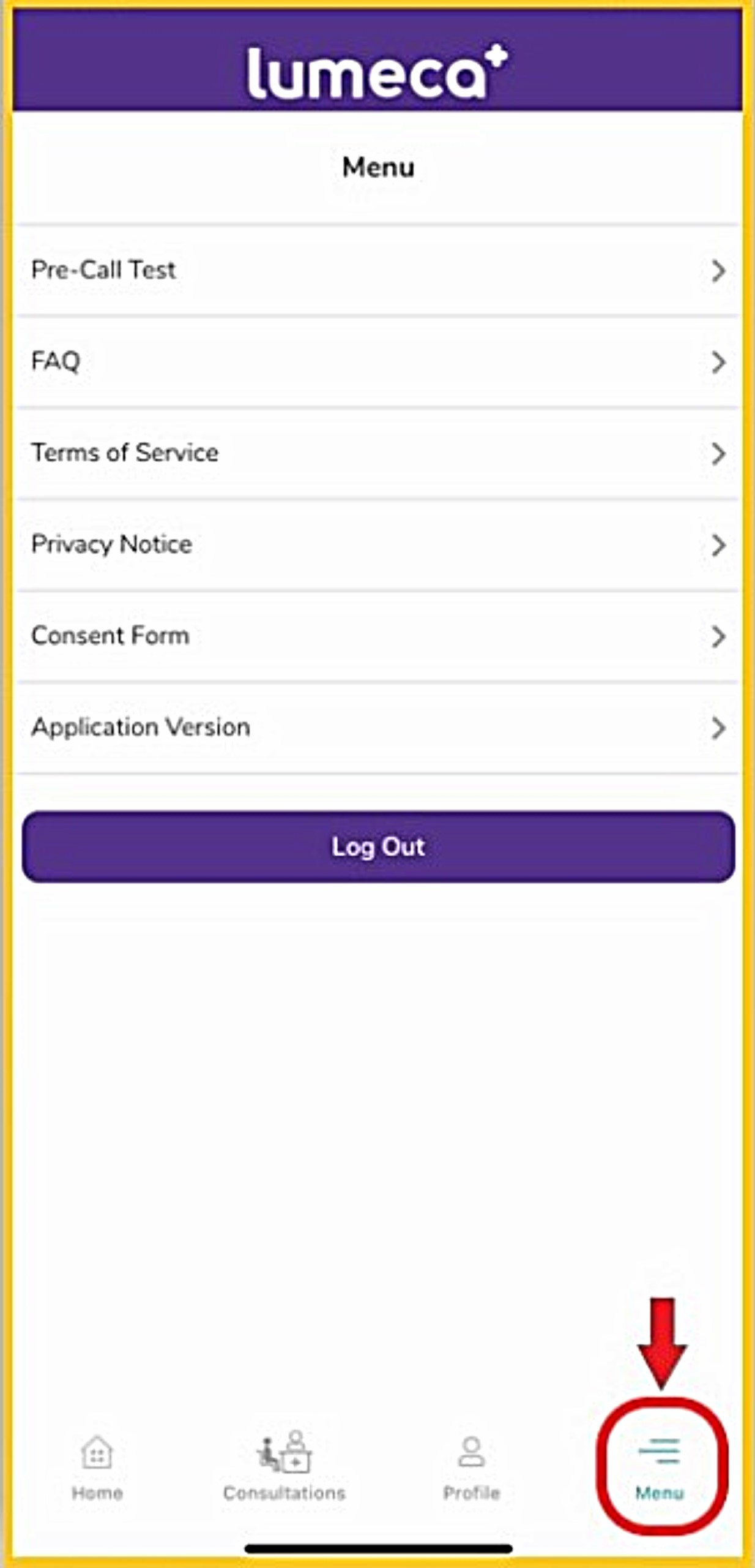 - When logged into your 'Lumeca' account, click 'Menu' on the bottom navigation bar, then select 'Pre-Call Test'.
