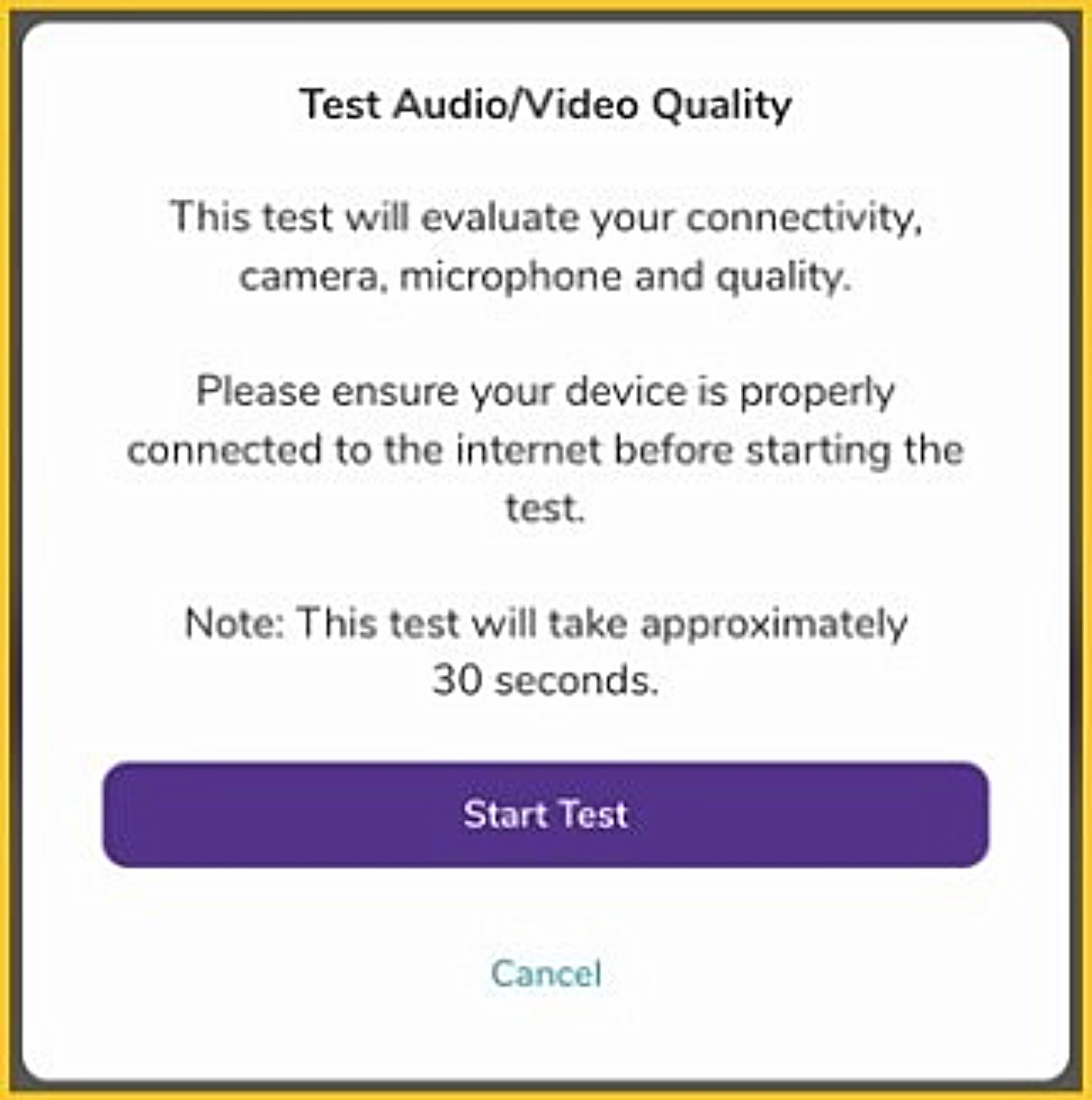- Ensure your device is on a stable surface and speak, to ensure your camera and microphone are tested properly. The test takes approximately 30 seconds and will let you know the quality of your audio and video and if there are issues.