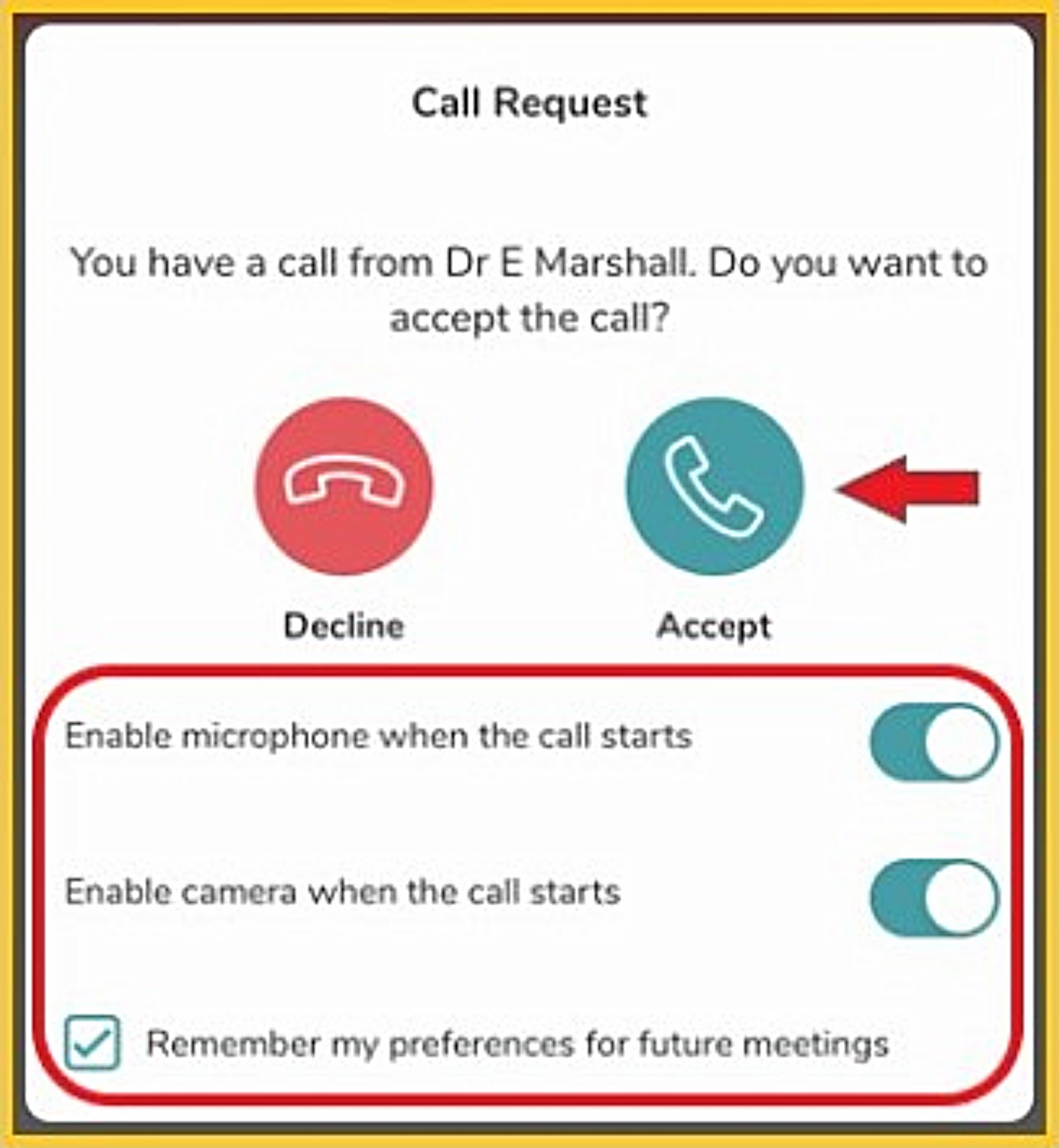 - Enable your microphone and camera on this screen, check 'Remember my preferences for future meetings' to save these settings.