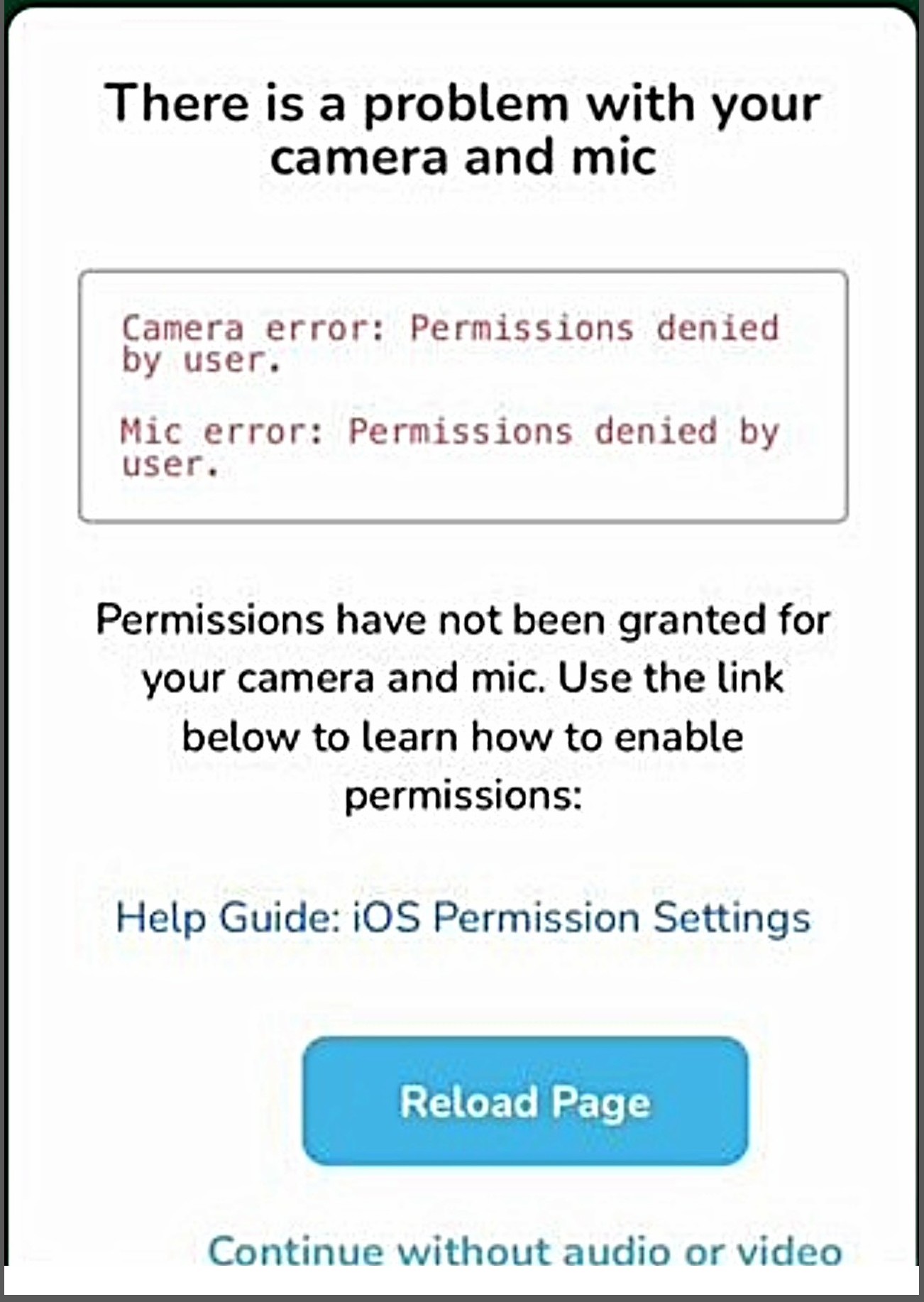 If you have blocked or denied your camera/microphone when joining a video meeting on the WEB, you will receive this error screen: