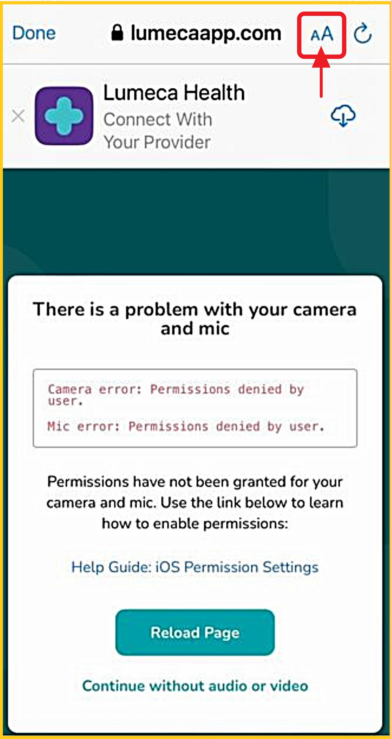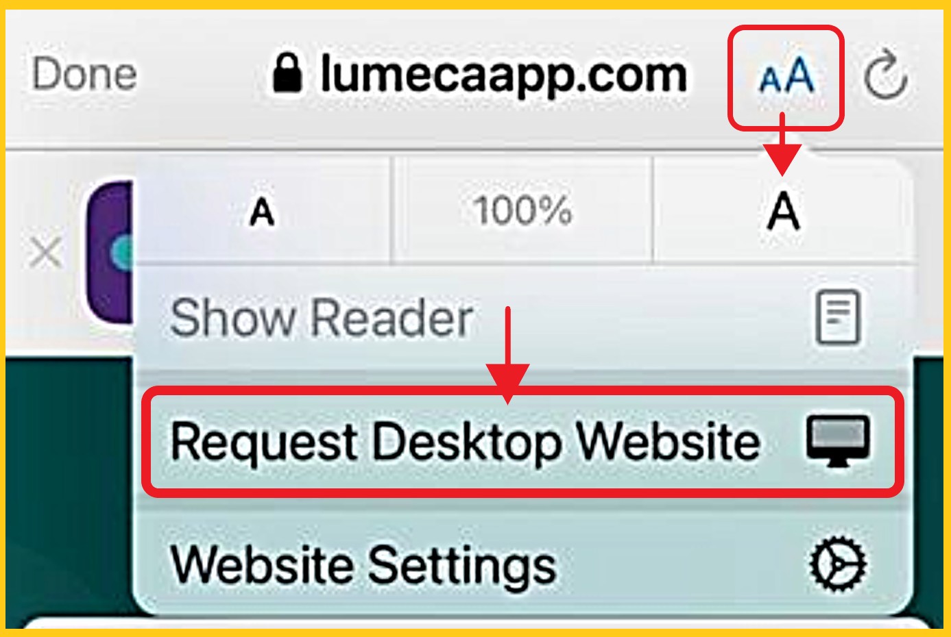 Tap the 'AA' on the top-right. If you do not see this, go to Section 2 (Browser Settings) or Section 3 ('Lumeca Health' APP Settings), depending on which you are using.