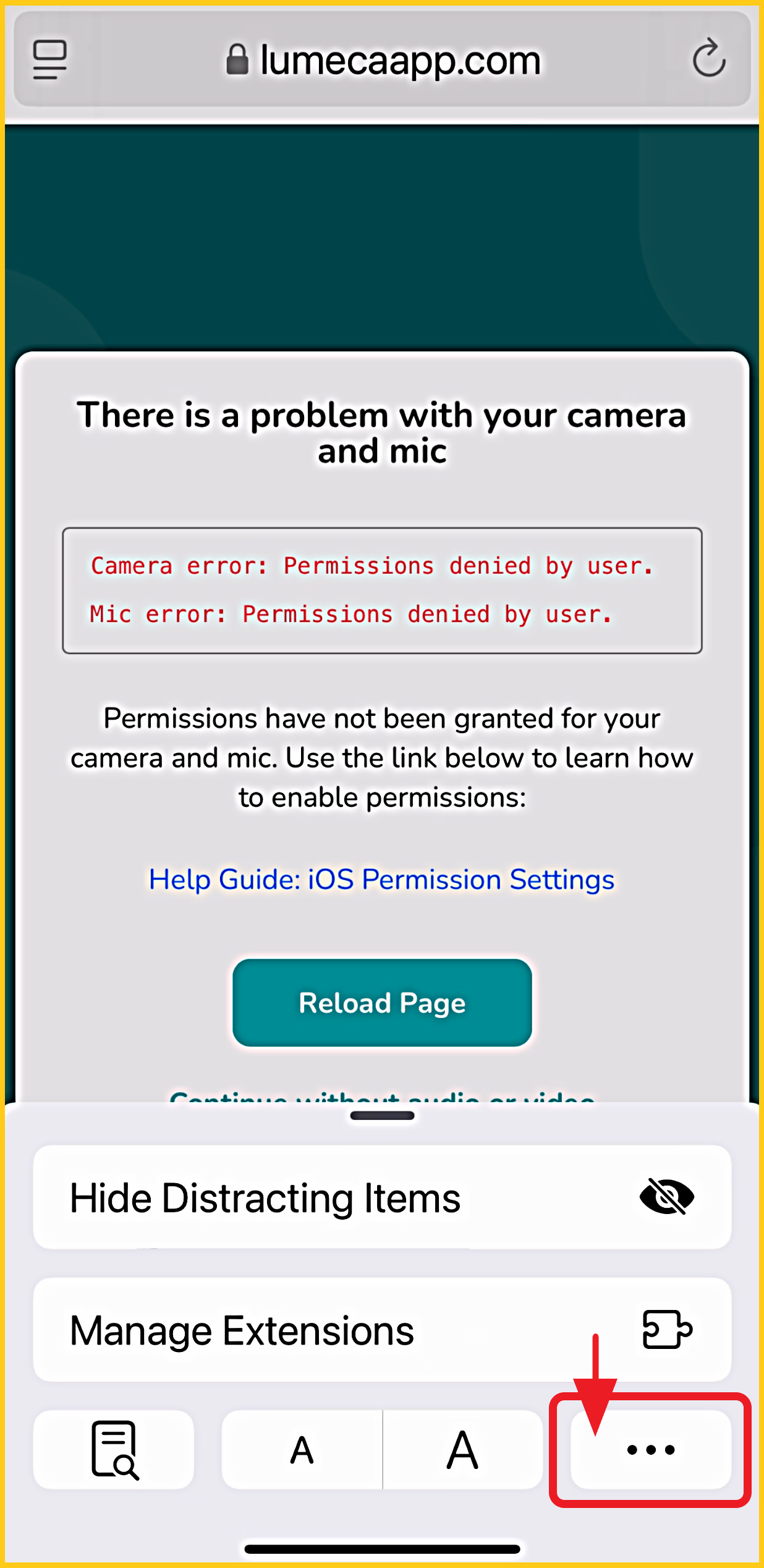 Tap onto the error screen, then tap the '3 dots' on the lower-right. If you do not see this, go to Section 2 (Browser Settings) or Section 3 ('Lumeca Health' APP Settings), depending on which you are using. |