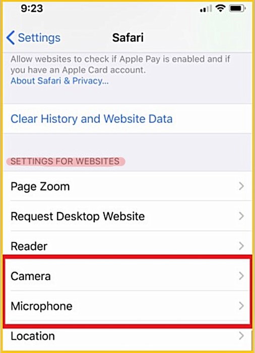 Scroll down and find 'Camera' and 'Microphone'. |