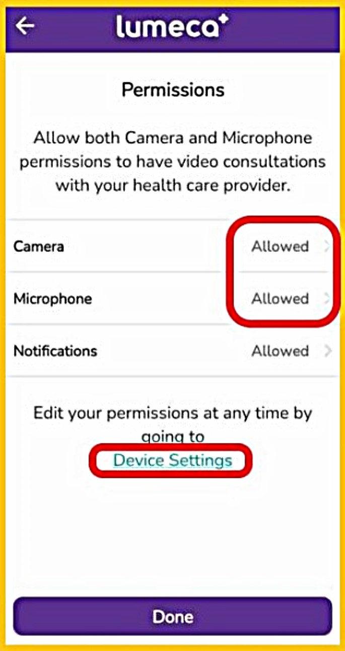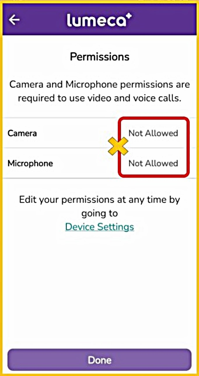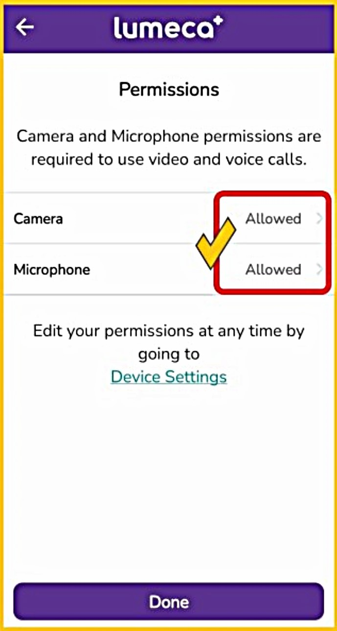 - Make sure your microphone and camera are Enabled/Allowed under your ‘Device Settings’ if using the ‘Lumeca’ APP.