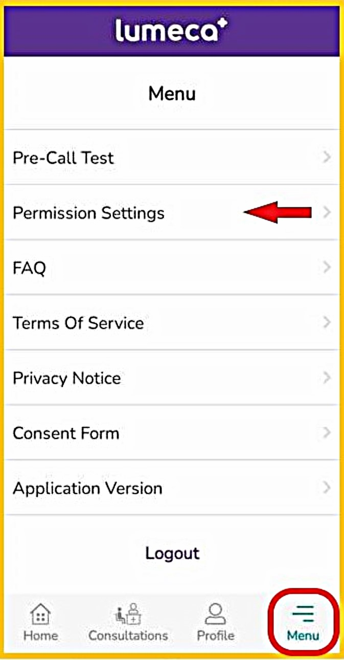 - After creating your Lumeca account and logging in, click 'Menu' on the bottom navigation bar, then select 'Permission Settings'.