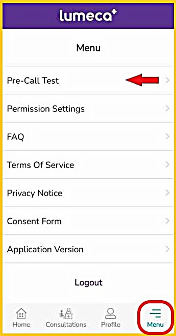 - Click 'Menu' on the bottom navigation bar, then select 'Pre-Call Test'.