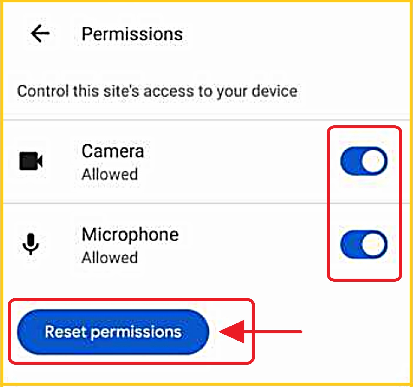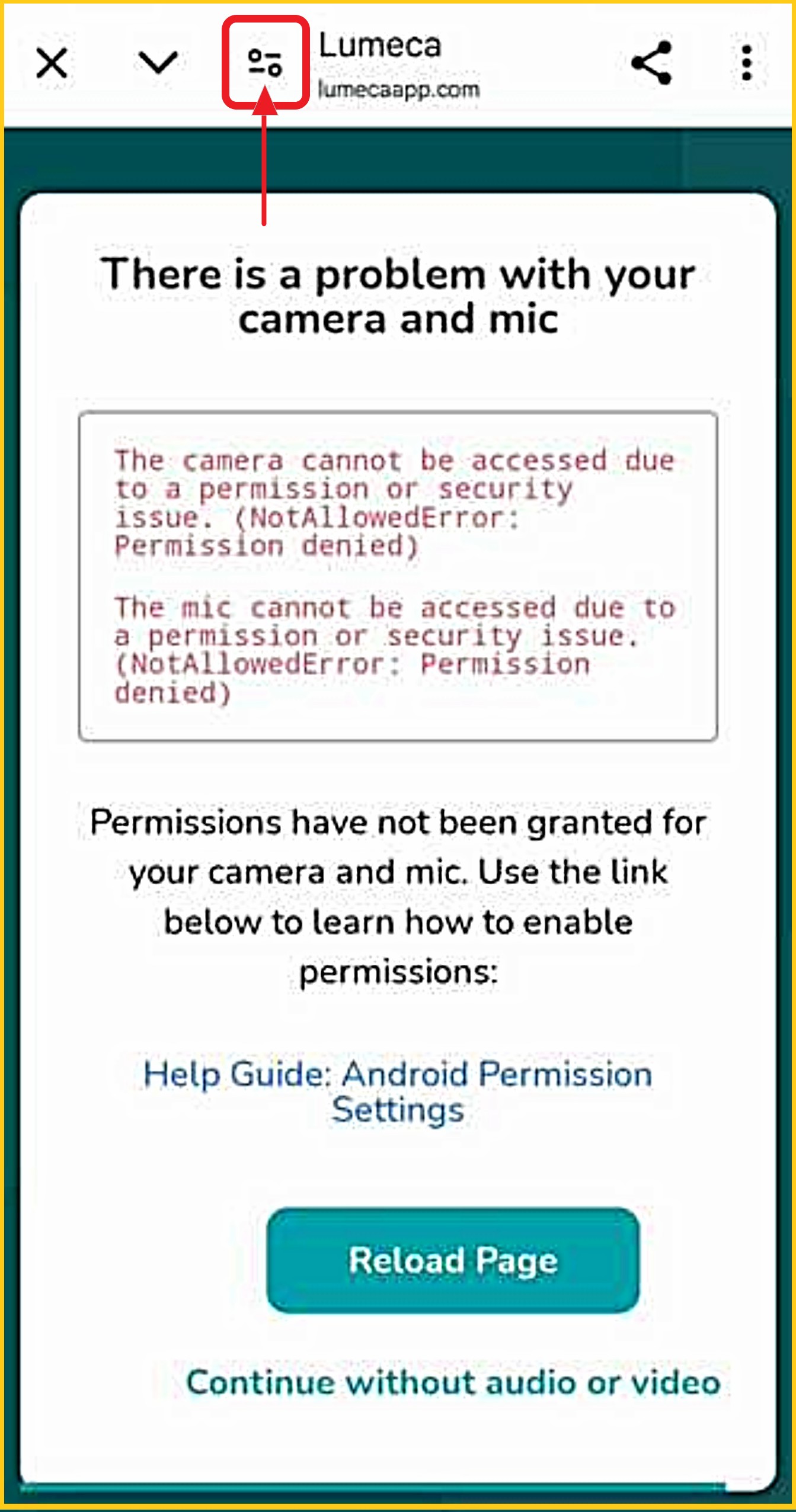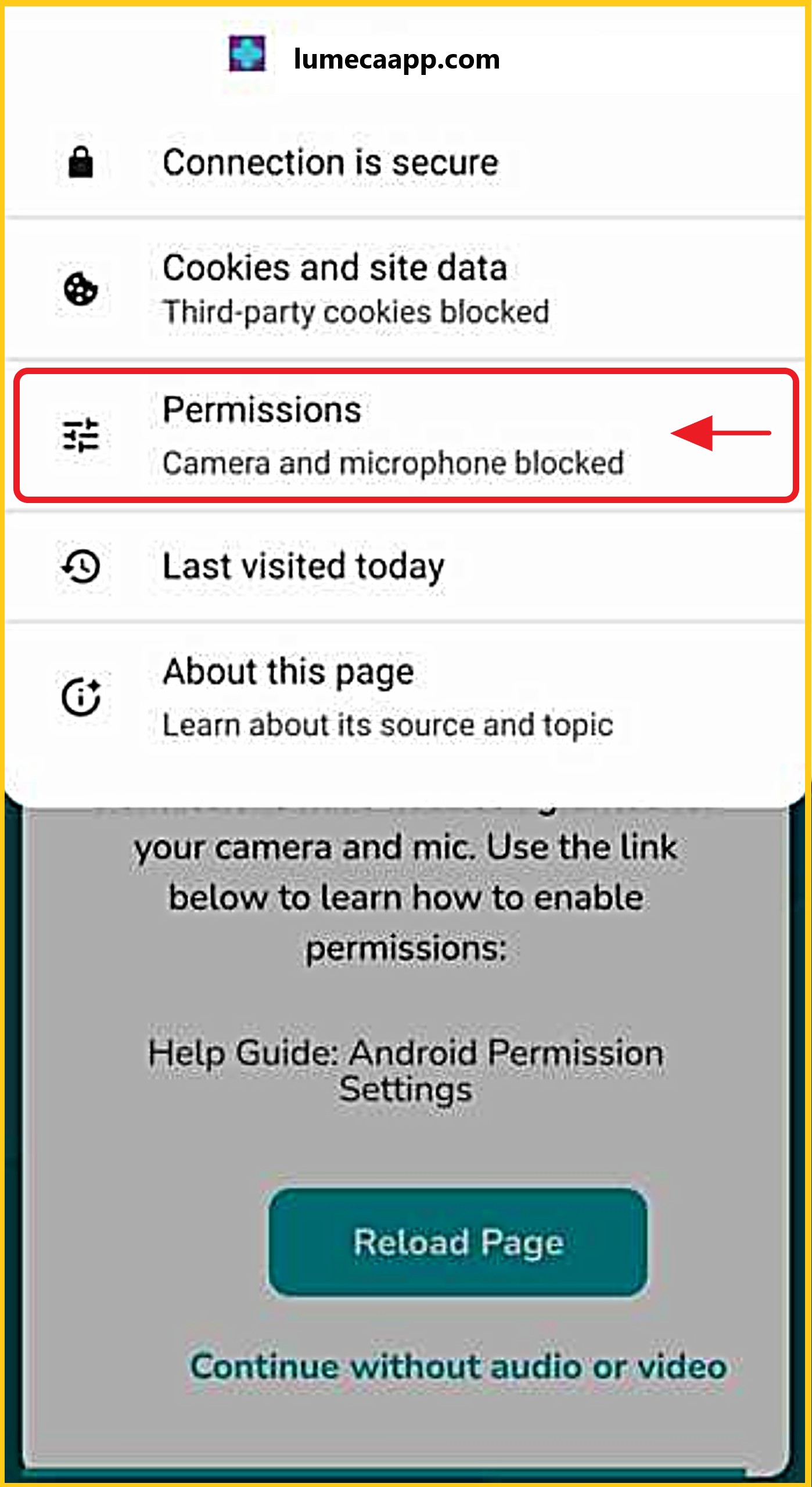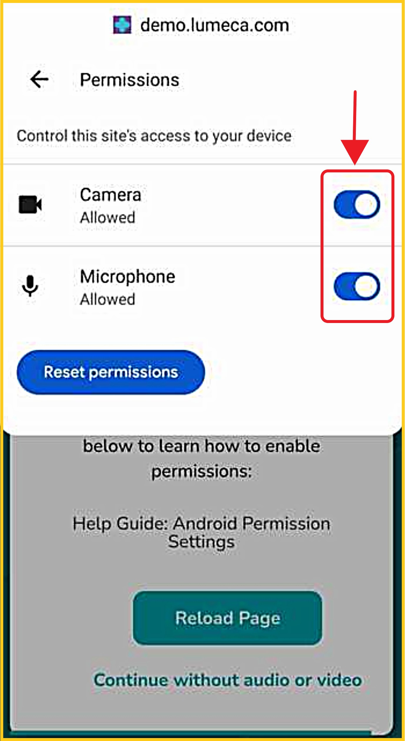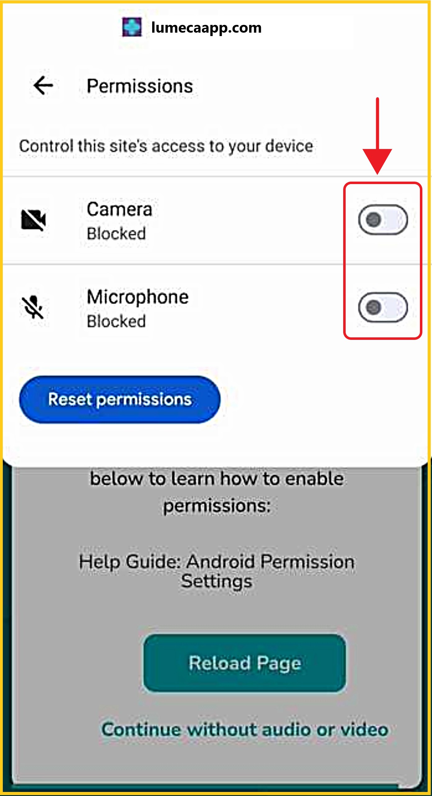 Tap 'Reset Permissions', then 'Allow/Enable' both your camera and microphone.
