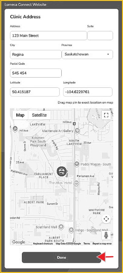 Step 5 - Confirm your Clinic Address, then click 'Done'.