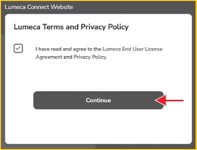 Step 6 - Check that you have read and agree to the 'Lumeca End User License Agreement' and 'Privacy Policy', then click 'Continue'.