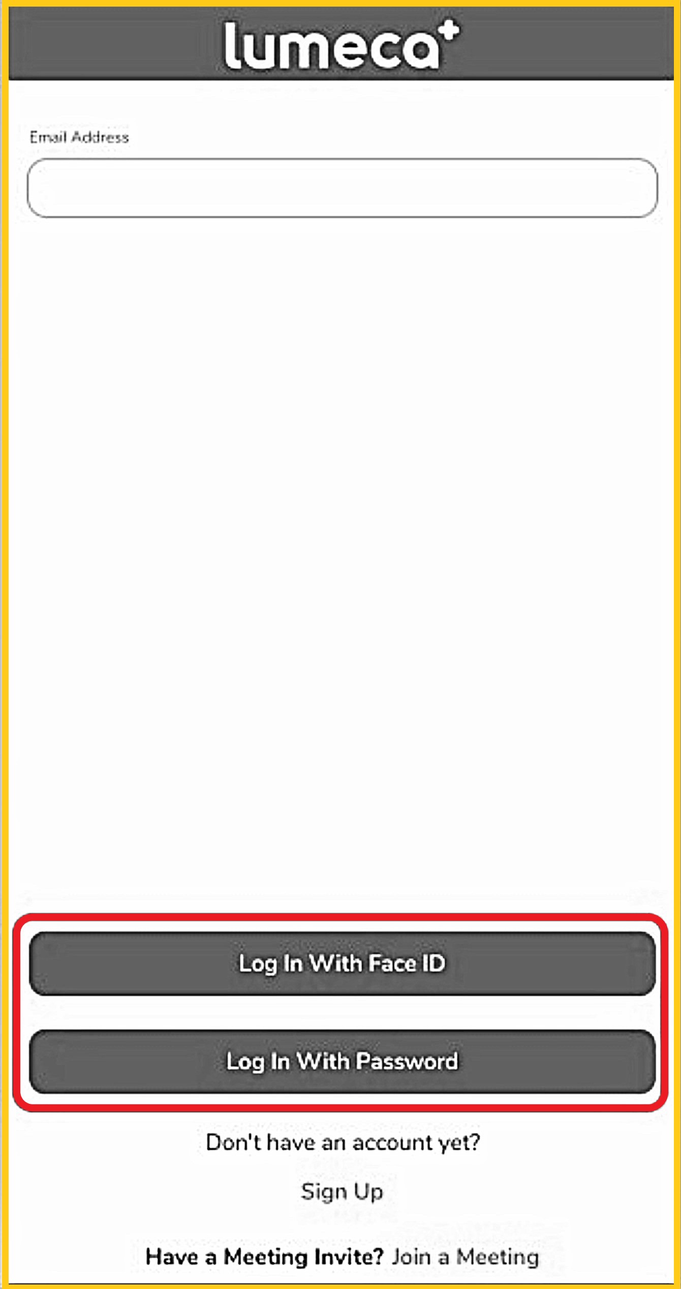 If you chose 'Yes' and completed the setup process, when you get to the Lumeca APP Login screen, you will have the choice to either,