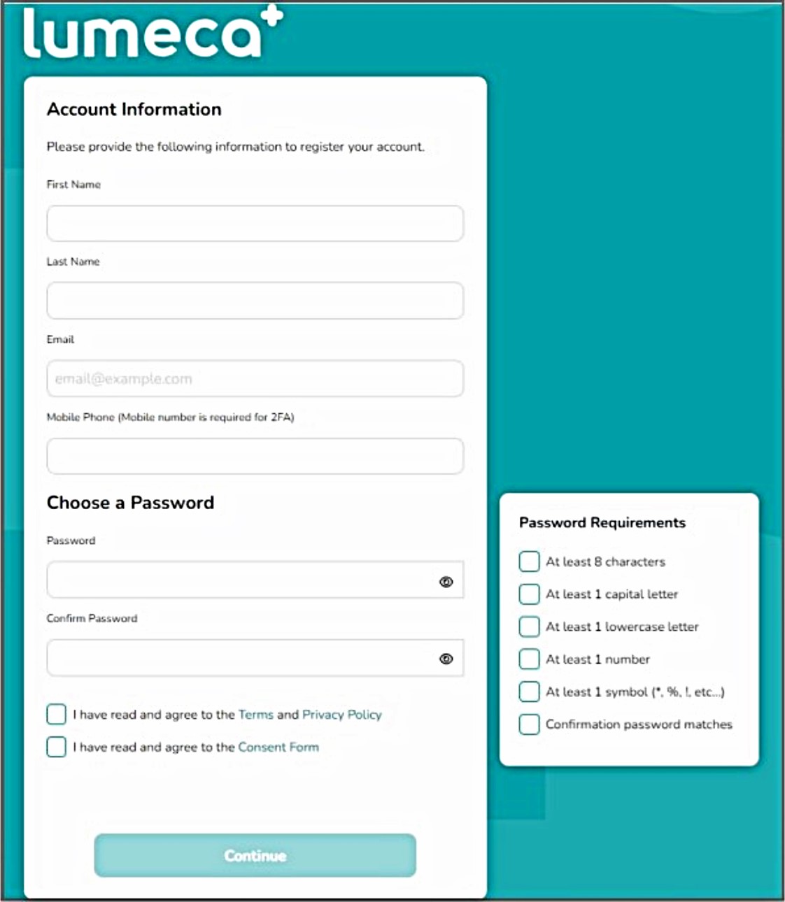 Step 2 - Enter your account information. The 'Continue' button will remain greyed out until all information is complete. When complete, click 'Continue'.