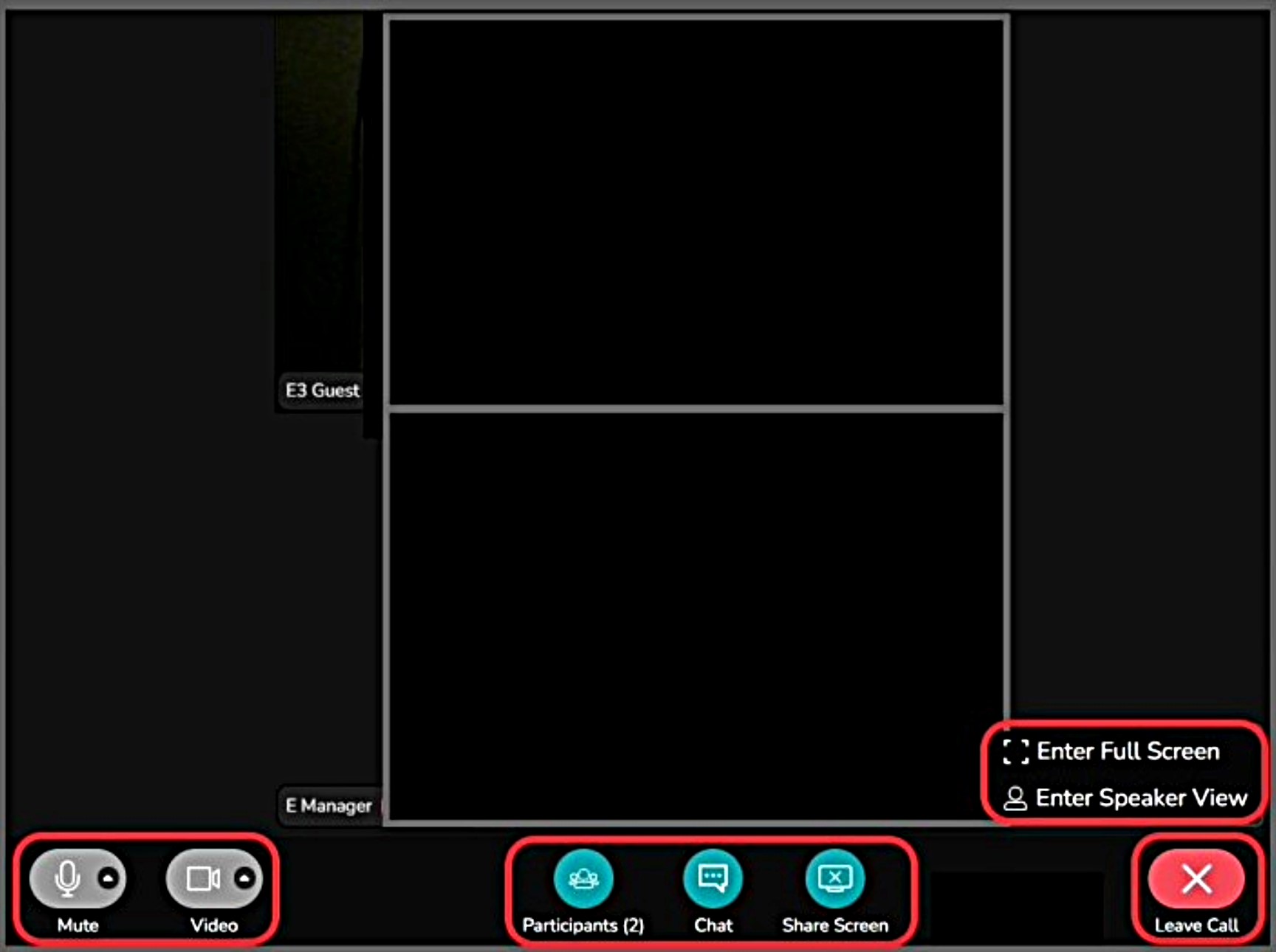 - Video images of all participants who have joined - selections include 'Full Screen', ' Speaker View' and 'Gallery View'