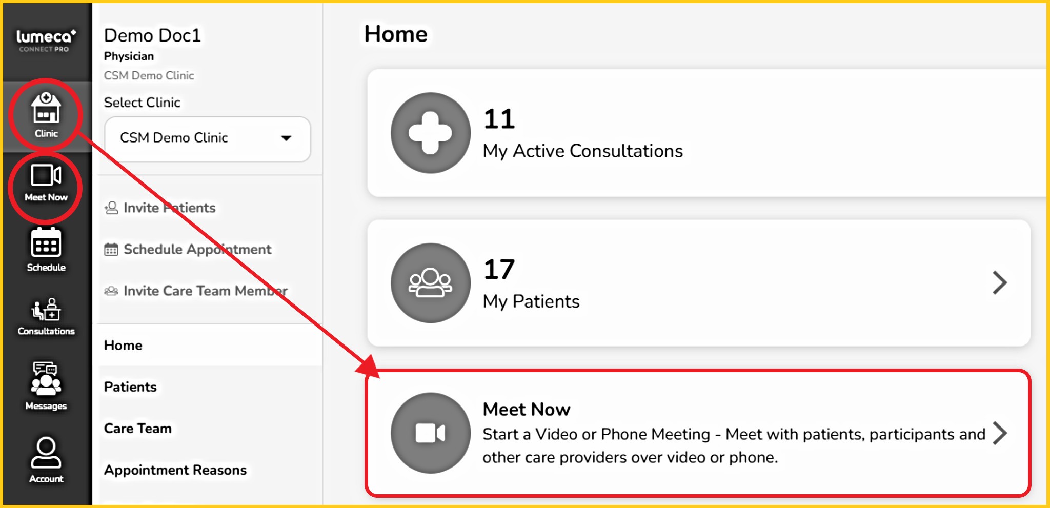 - The 'Clinic' tab, then 'Meet Now', or