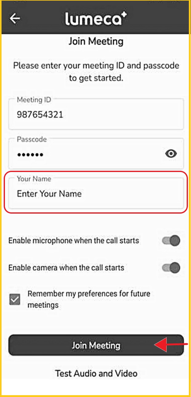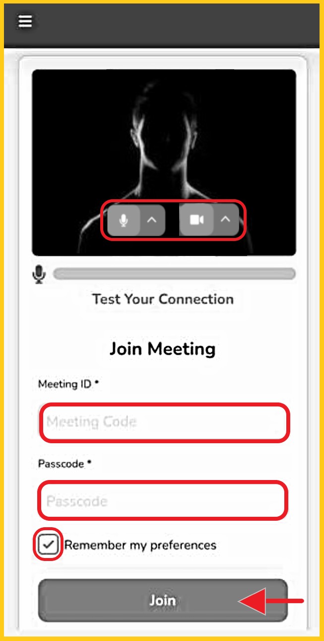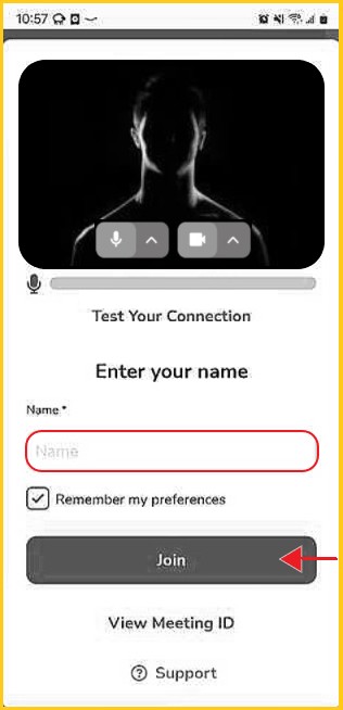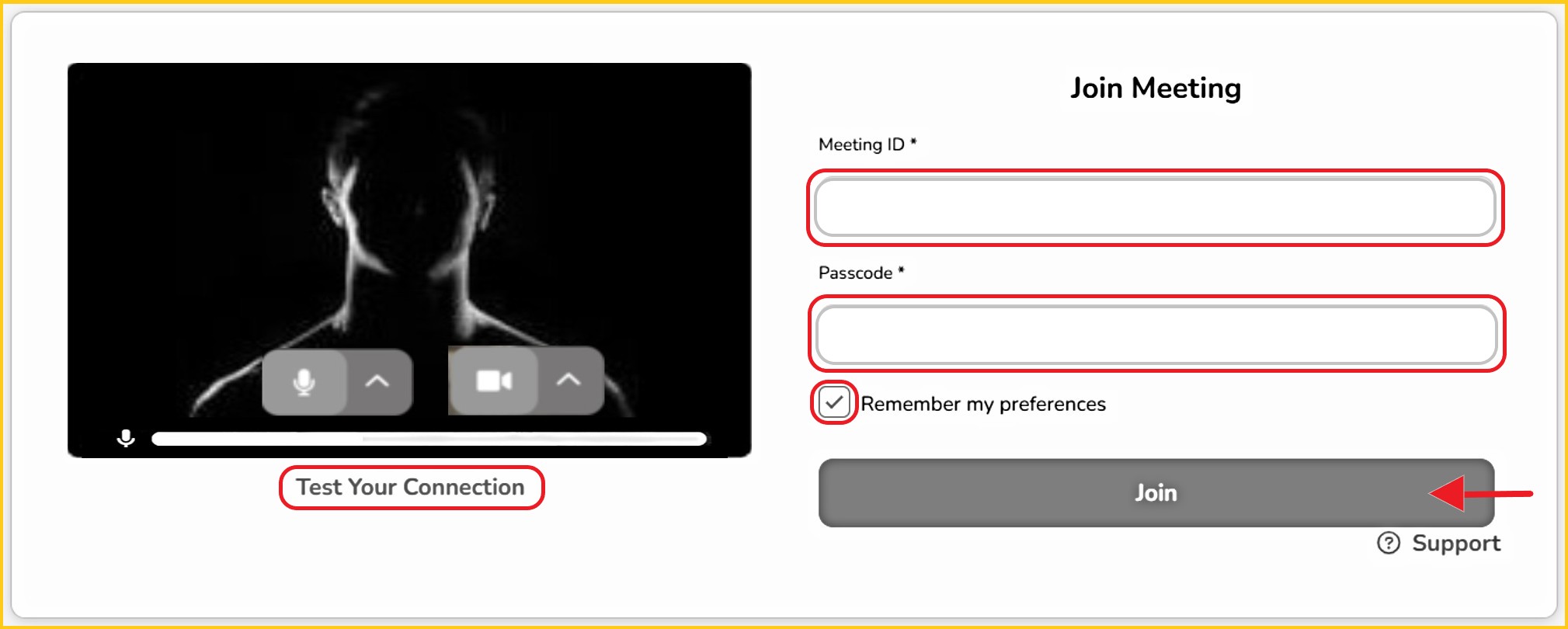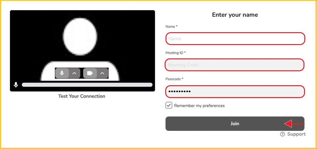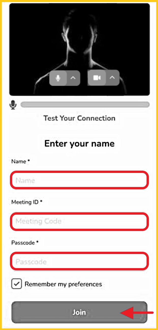 - If you want your camera/microphone settings and name saved for next time, check ‘Remember my preferences’.