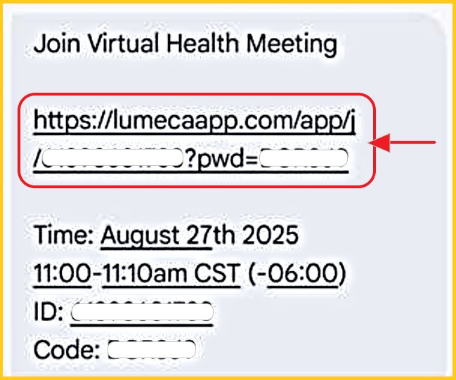 Step 1: Using the same device you are using to attend your video meeting, open the email or SMS text message and click the 'https://...' meeting link sent to you.