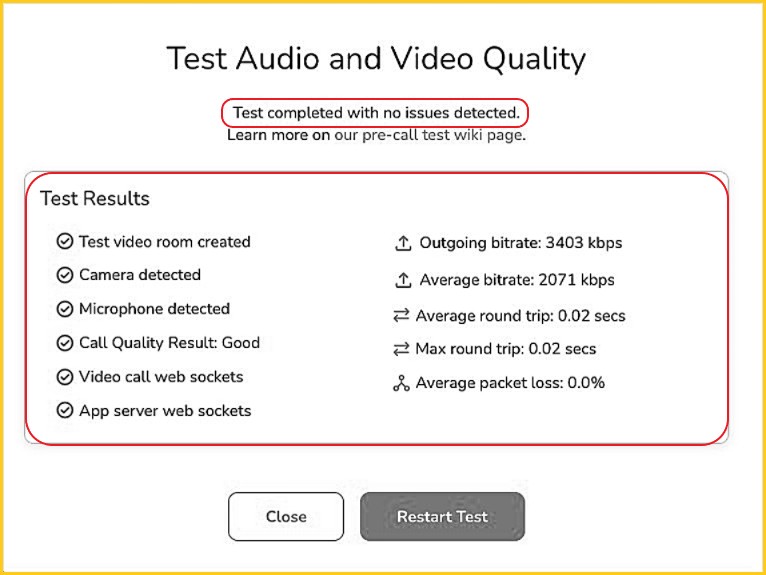 'test' = either the 'Pre-Call Test' or 'Test Your Connection' feature |
