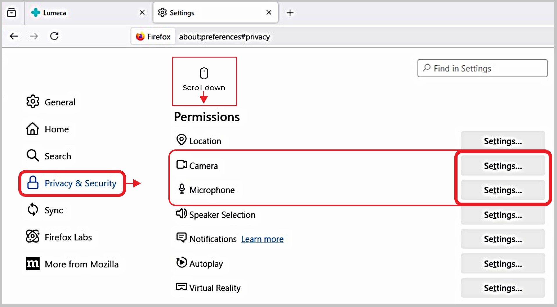 - Click 'Privacy & Security', then scroll down to 'Permissions' and select 'Settings' next to 'Camera' and 'Microphone' consecutively.