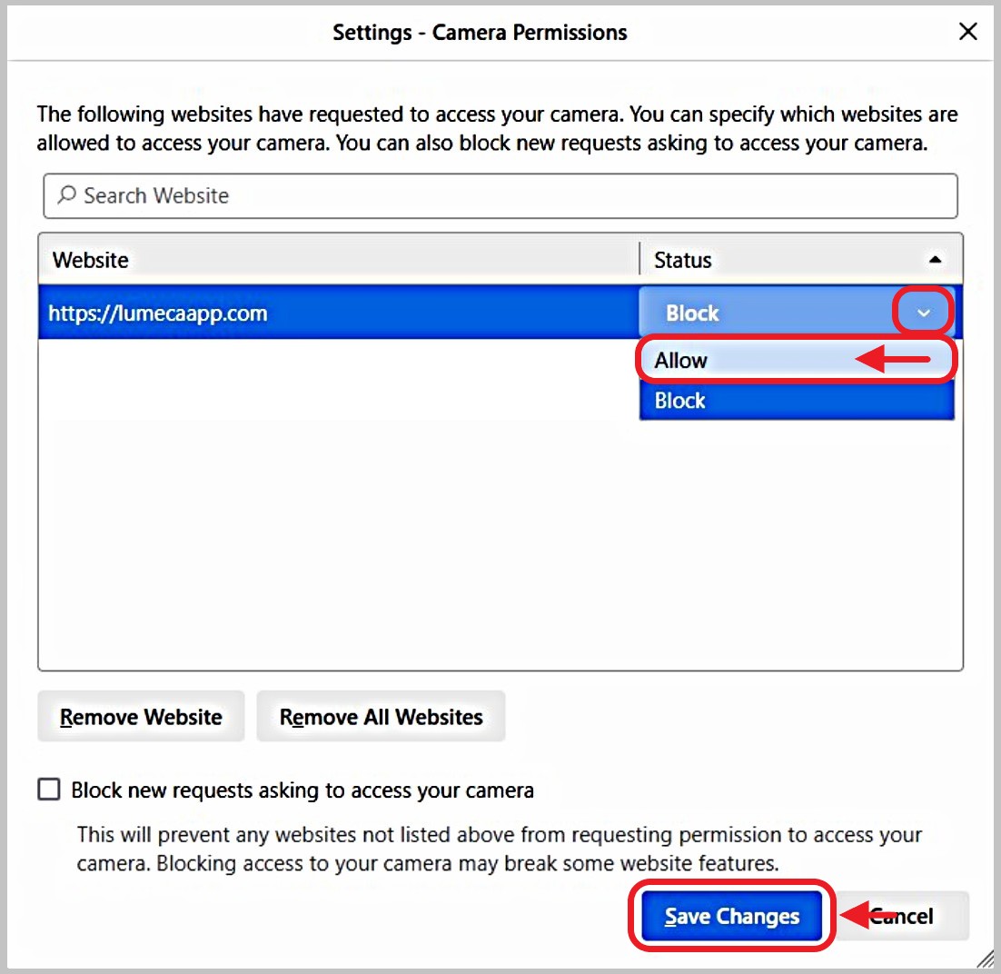 - If the 'Status' of https://lumecapp.com says 'Block' (as shown below), click onto the word 'Block' and select 'Allow', then 'Save Changes'.