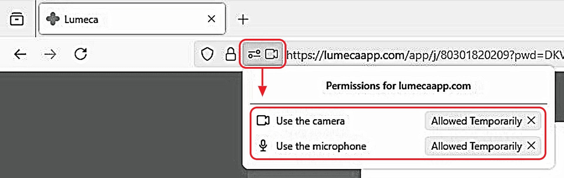 symbol on the address bar and note your camera and microphone are blocked: