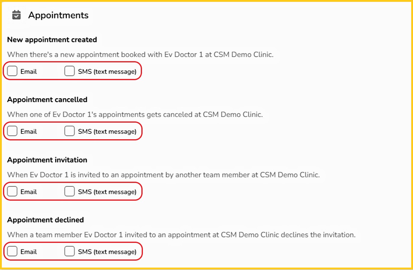 - Clinic admins configure notifications for the providers they want to receive alerts for, regardless of whether they modified the appointment or another admin did so.