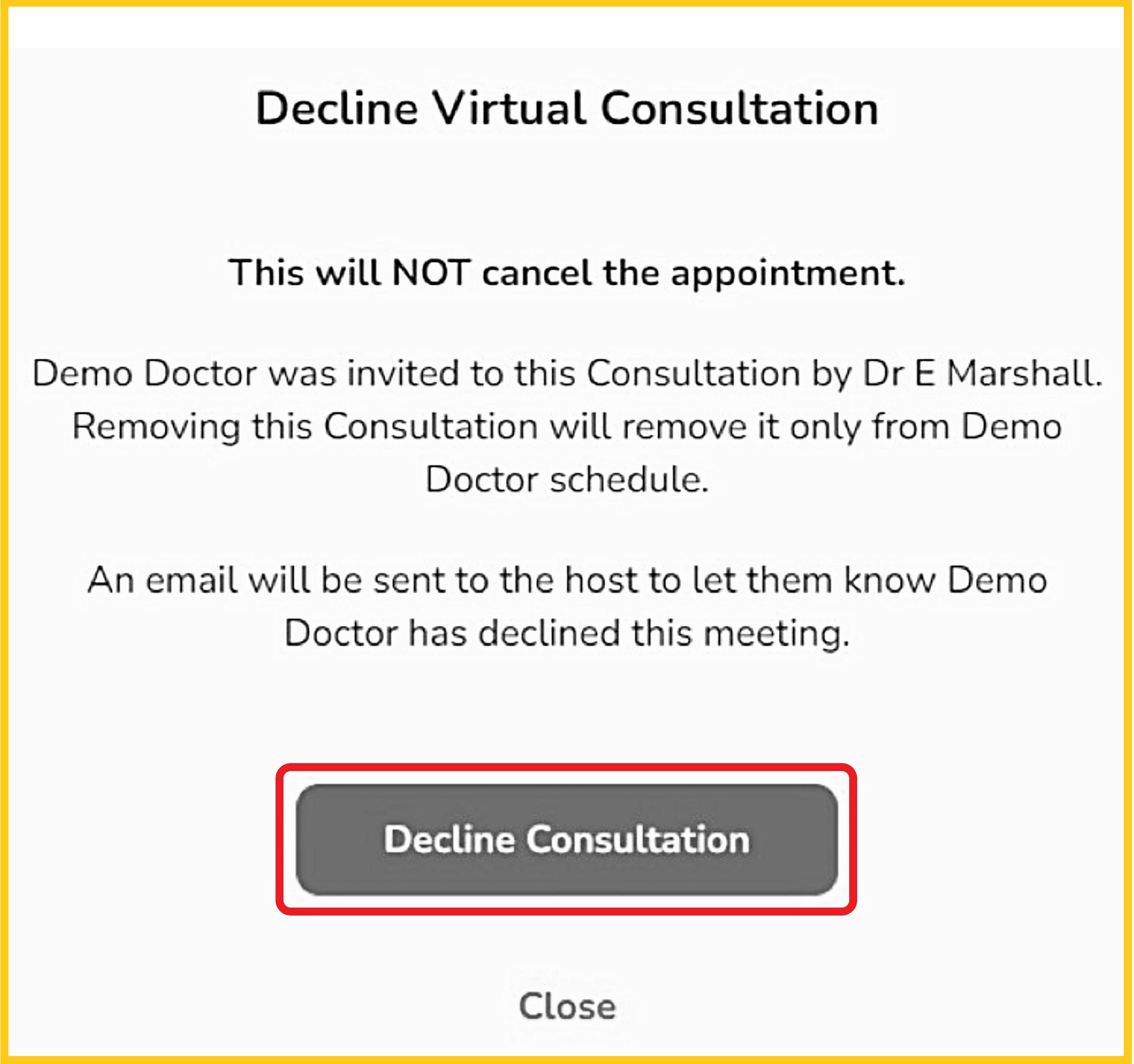 IMPORTANT - AFTER THE HOST ENTERS AND STARTS THE CONSULTATION - the 'Decline' button will change to 'Leave Consultation'.