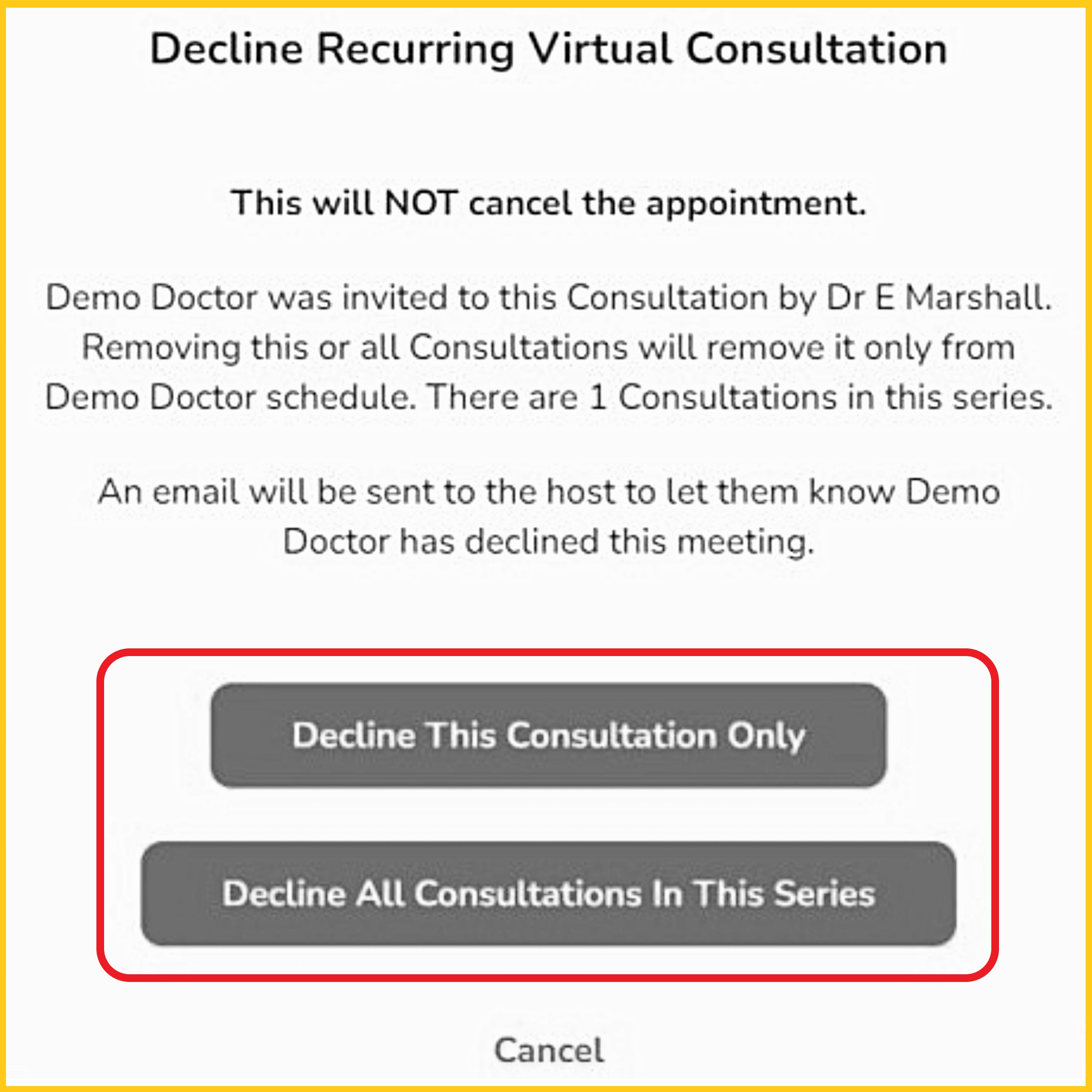 - Under the 'Schedule' tab, find the scheduled consultation, then select either 'Decline This Consultation Only' or 'Decline All Consultations in This Series'.