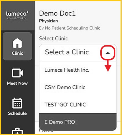 If you are working with more than one clinic/location, it is important you select the correct clinic from the drop-down under 'Select Clinic'. If you only belong to one clinic, you will not see this drop-down.