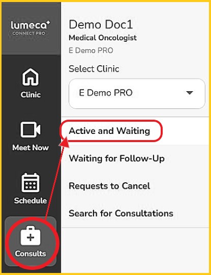 - From the left navigation bar, click 'Consultations', then 'Active and Waiting'.