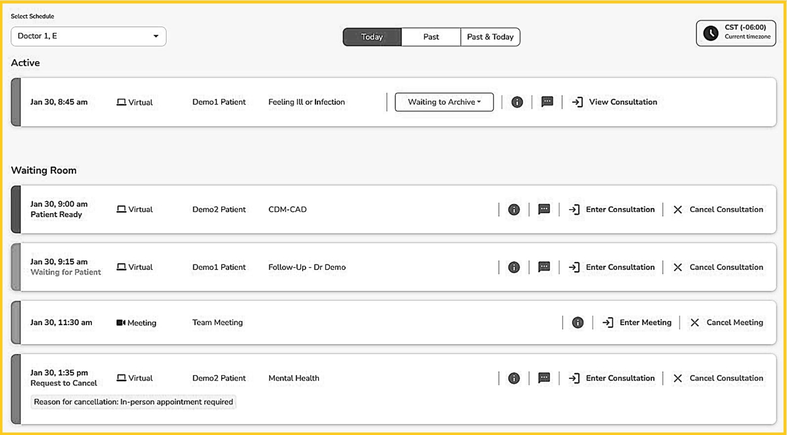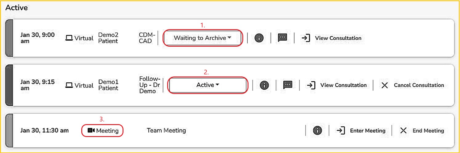 As soon as patient consultations or meetings are entered by the host provider or others from their clinic, the appointment automatically moves from the 'Pending' section to the 'Active' section. They include: