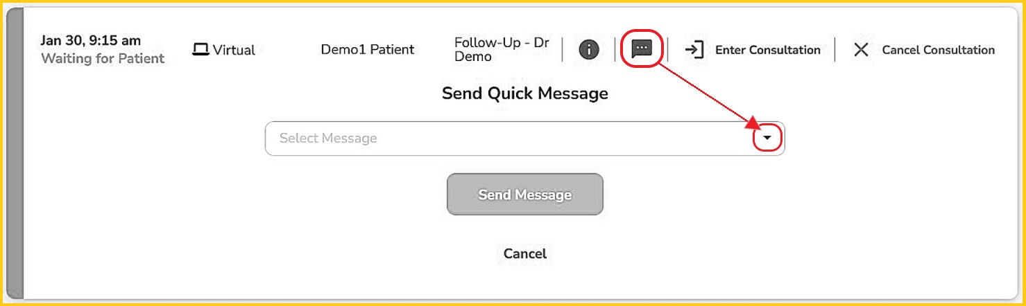 This feature only for scheduled 'patient consultations', not 'meetings'. A healthcare provider or clinic admin can send preset or customized Quick Messages to a patient letting the patient know things like: