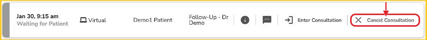 X Cancel - The host providers, or clinic admin acting on their behalf, can cancel video meetings or consultations. This cancels the appointment entirely and removes it from all invited providers’ schedules.