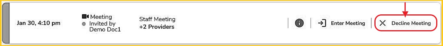 X Decline - Invited healthcare providers, or clinic admin acting on their behalf, can decline an invitation to a video meeting or patient consultation. This removes the appointment from this user's schedule and will not change the scheduled appointment or the schedules of the host or others who are invited.