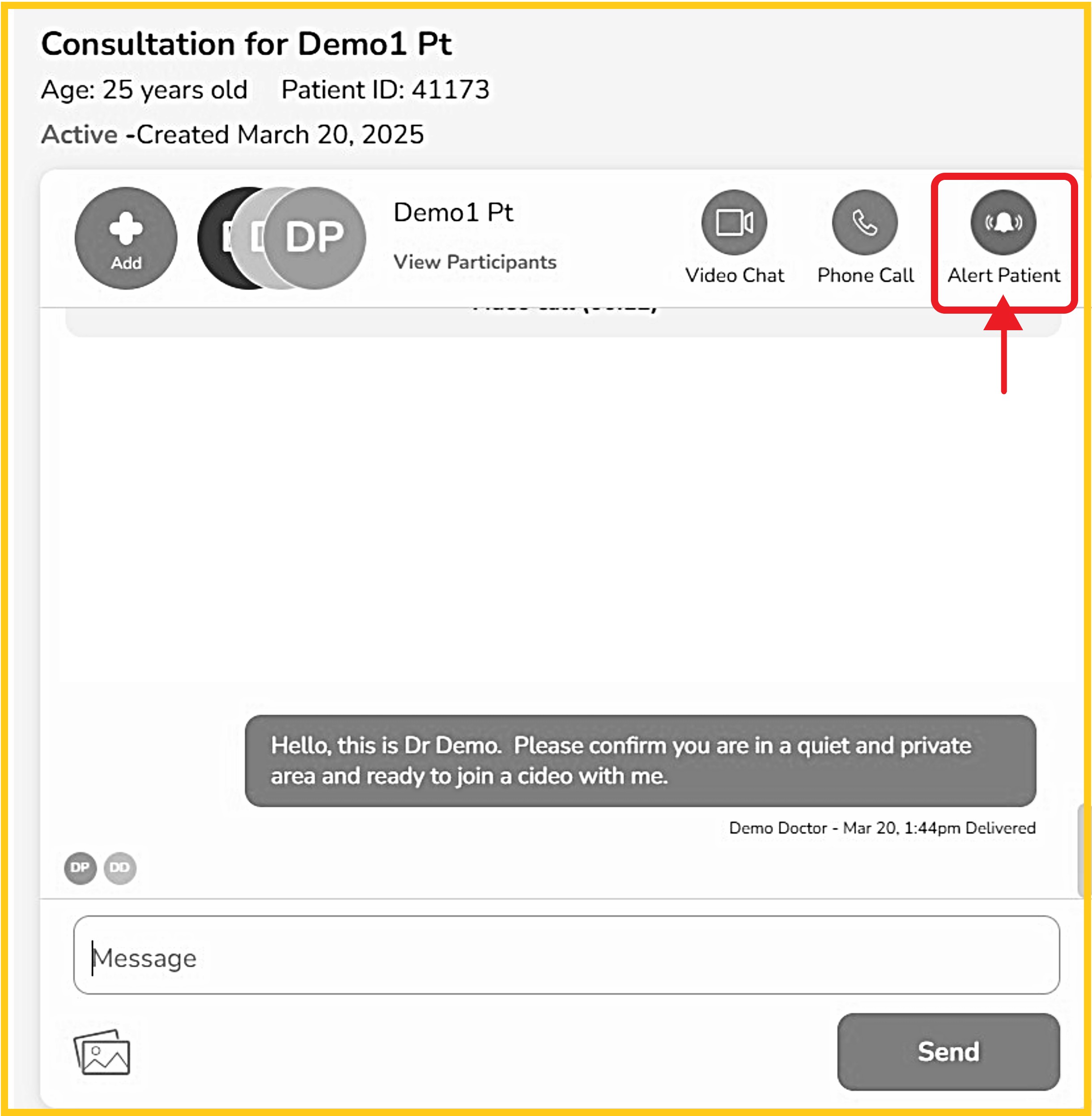 Step 1 - From within the consultation, if the patient does not respond to your introduction message or stops responding to you, click the red 'Alert Patient' button.