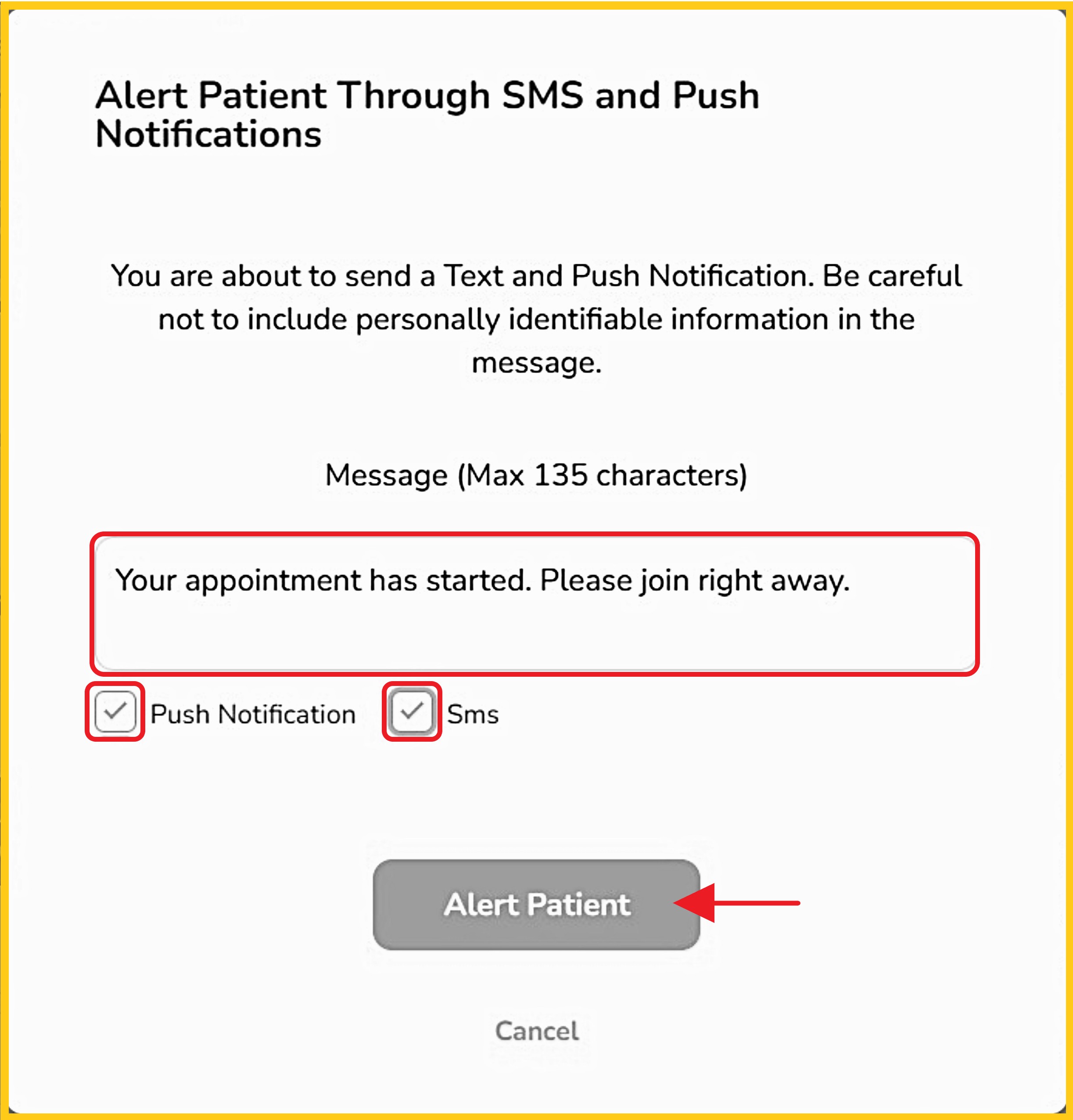 Step 2 - Enter a brief, generic message to alert the patient, remembering not to use personal information (no names or health issue) to ensure privacy. i.e. "Please enter the consultation for your appointment."