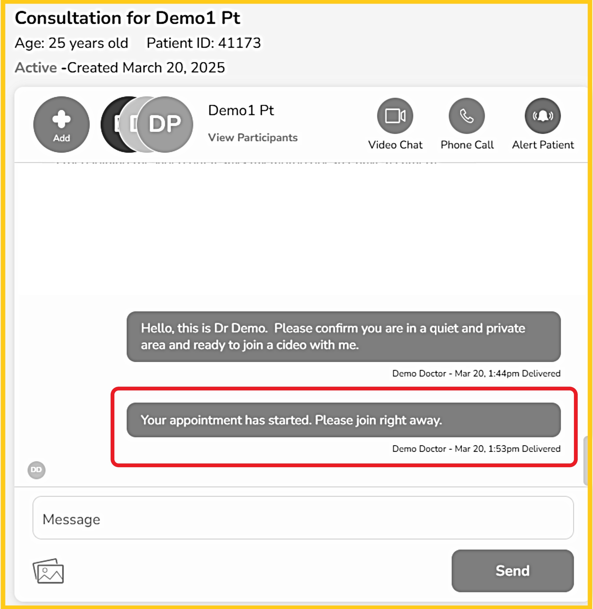 - 'Push Notifications' (sends alert message to consultation chat. If patient has 'notifications' enabled for the SK Virtual Visit app, they will also hear an alert.)