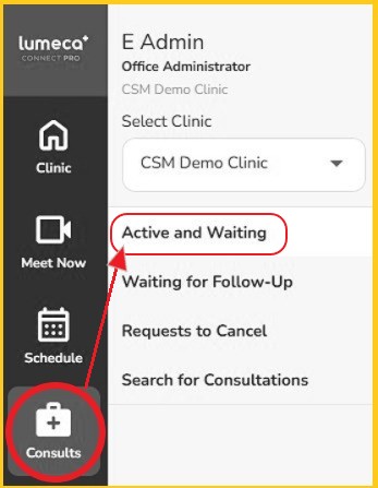 Step 1 - Select 'Consultations' from the left navigation bar, then 'Active and Waiting'.