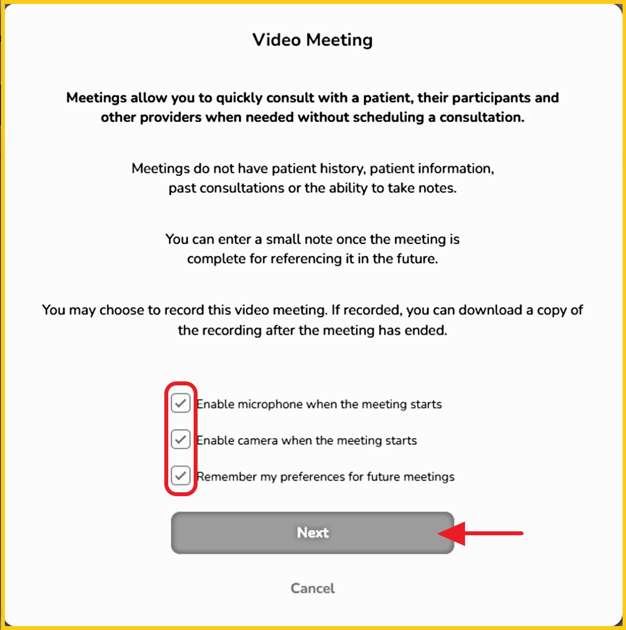 Step 3 - Review the information, then set your camera and microphone for when you enter the video call:
