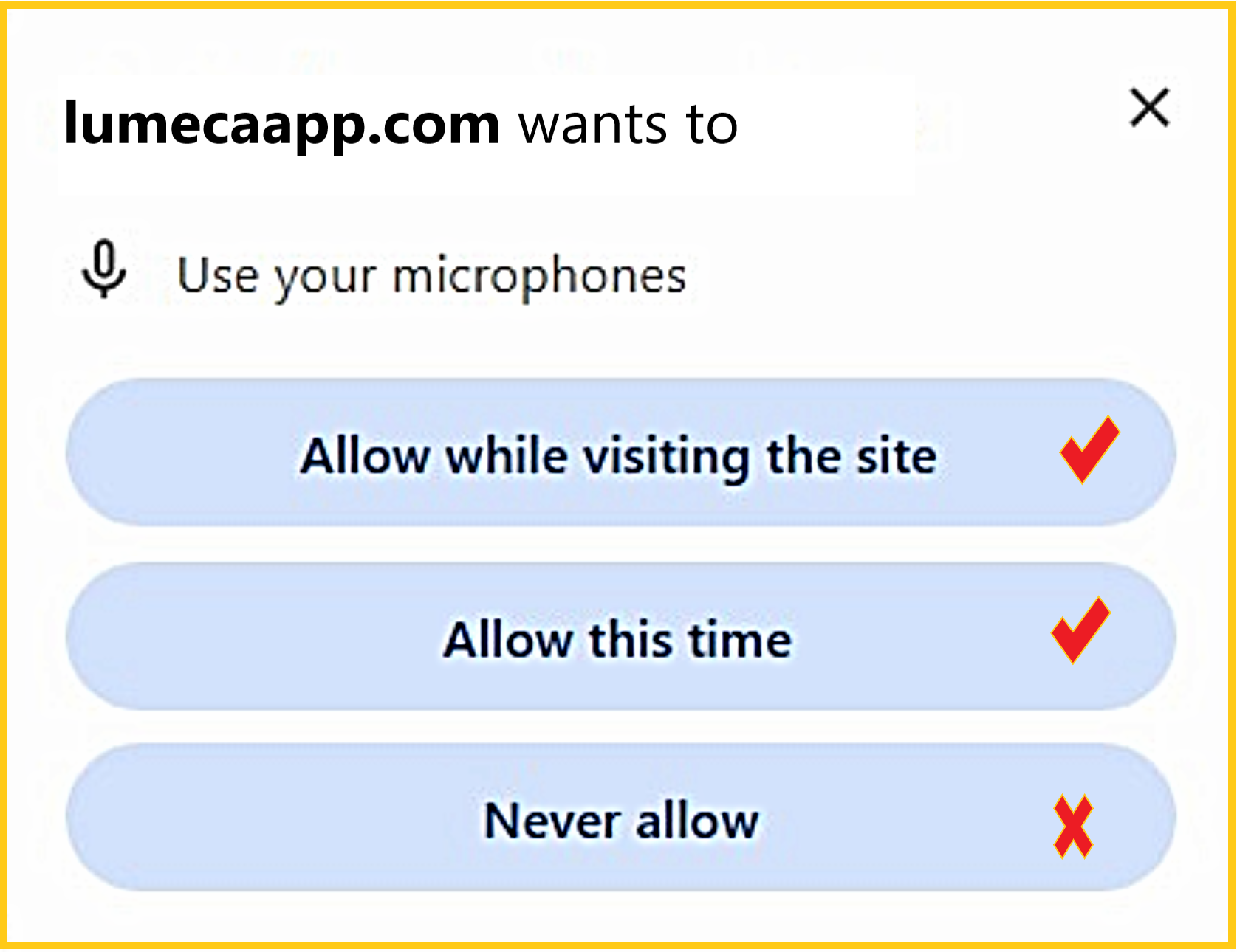Step 4 - You will be prompted to 'Allow' your camera and microphone for this website. Click 'Allow' for each. (Your prompt may vary from the images shown).