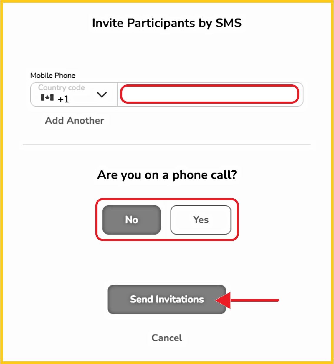 - If inviting more than one person, click '+Add Another' and add their mobile phone number(s).