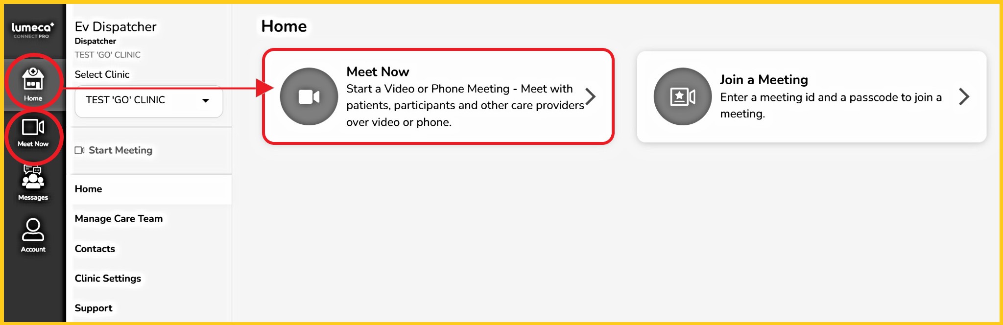 - The 'Home' tab, then 'Meet Now', or